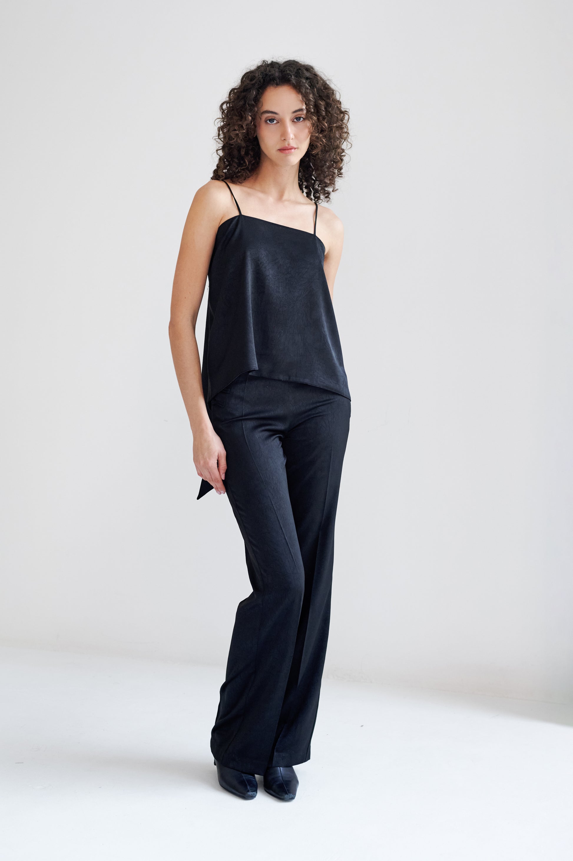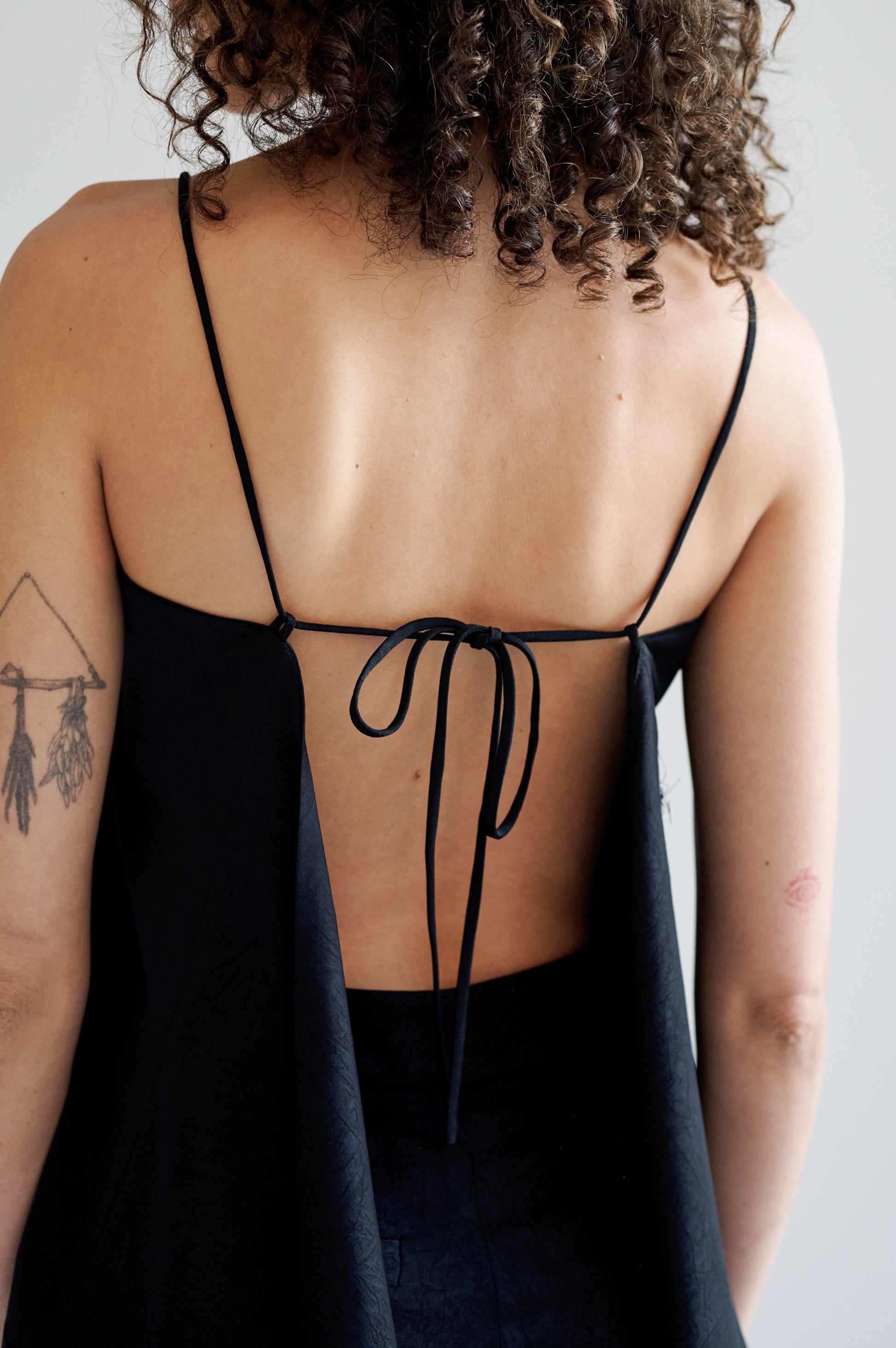 Top asimétrico sin espalda con tirantes espagueti y ajuste posterior.