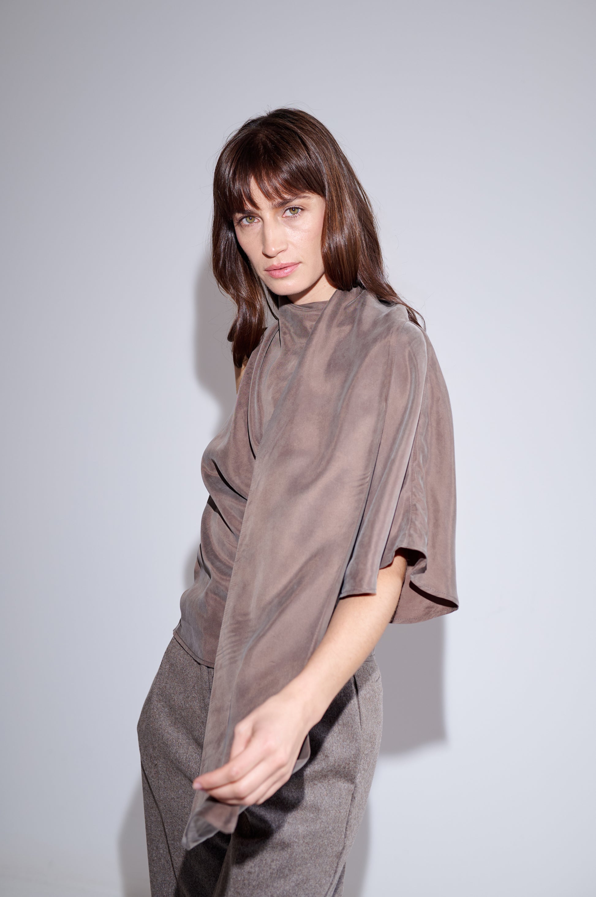 Top con diseño asimétrico, manga amplia y capa integrada.