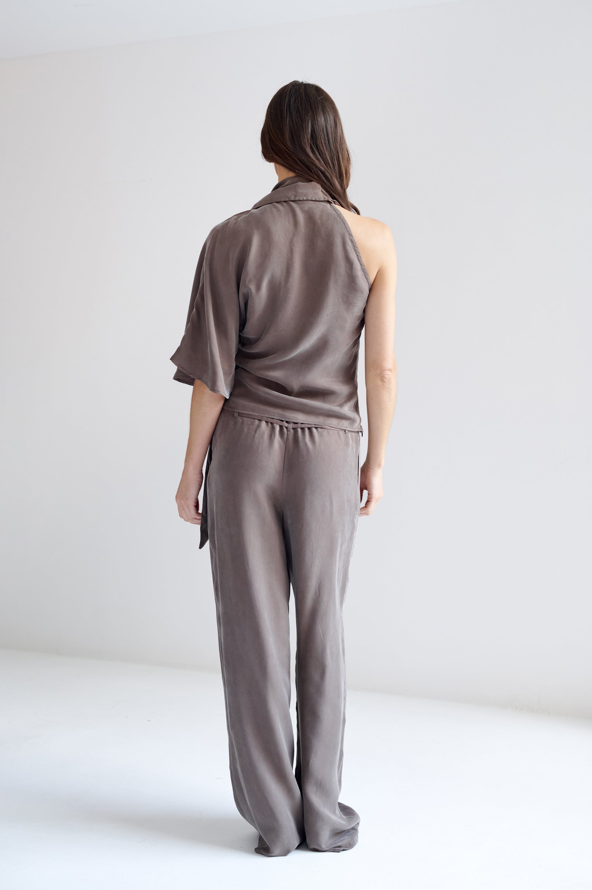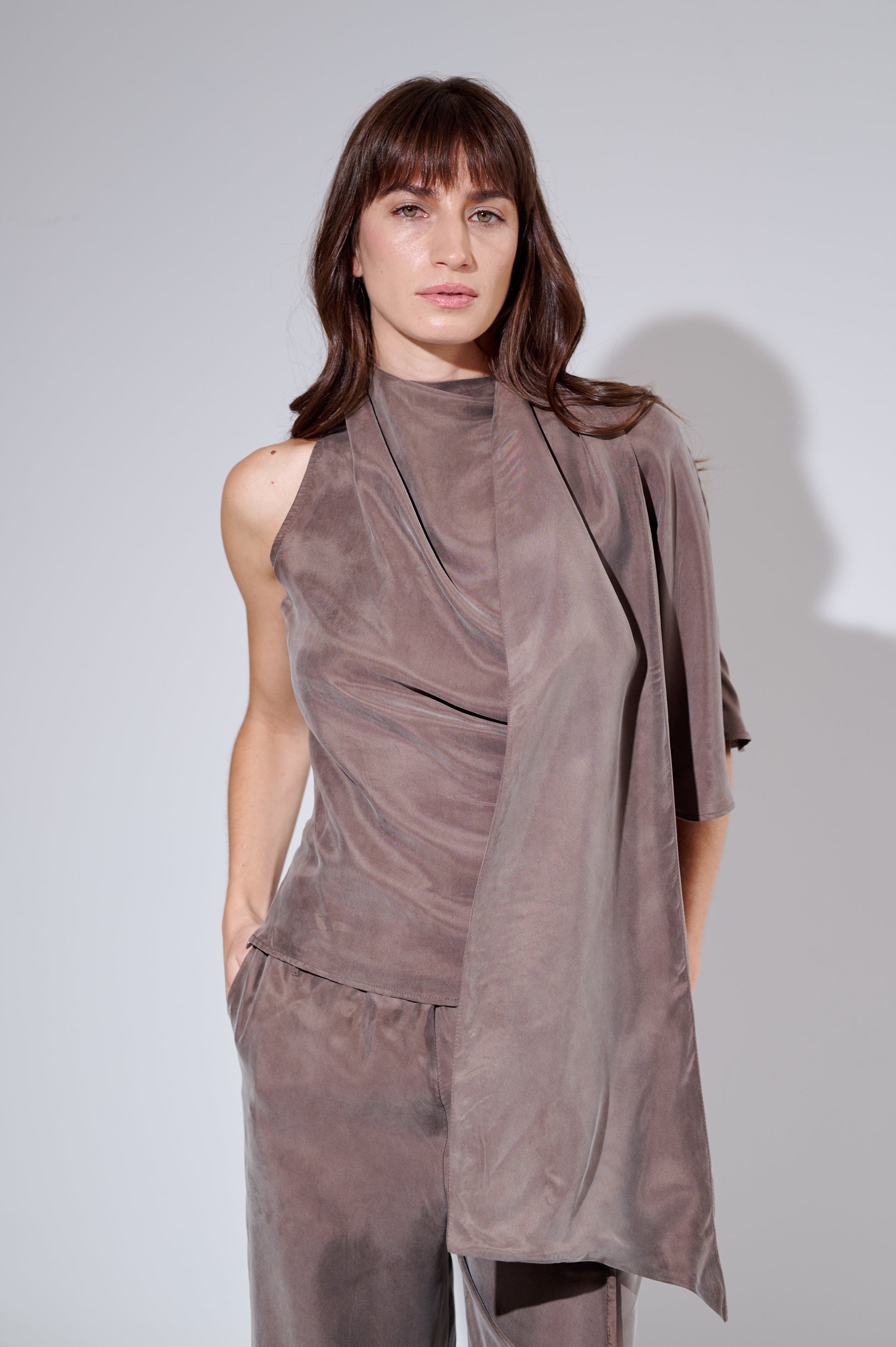 Top con diseño asimétrico. Detalle de capa integrada que recorre el frente. Presenta un solo hombro descubierto y manga amplia en el lado opuesto
