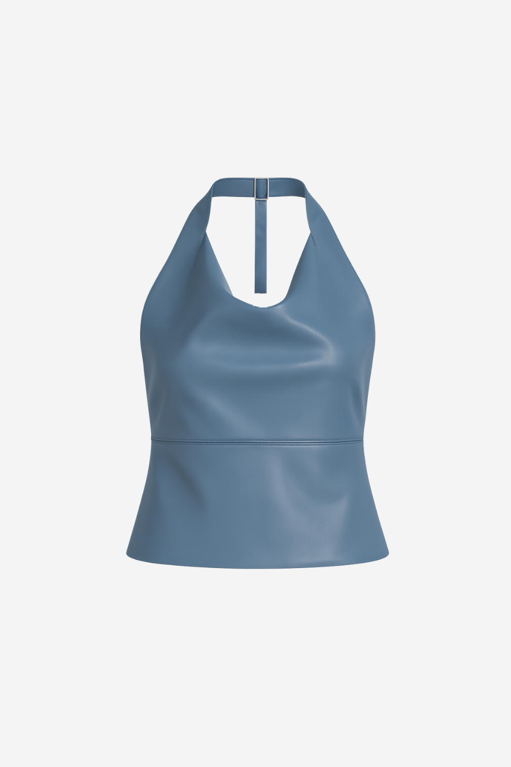 Top halter de piel vegana con escote en la espalda y cintura ajustable.