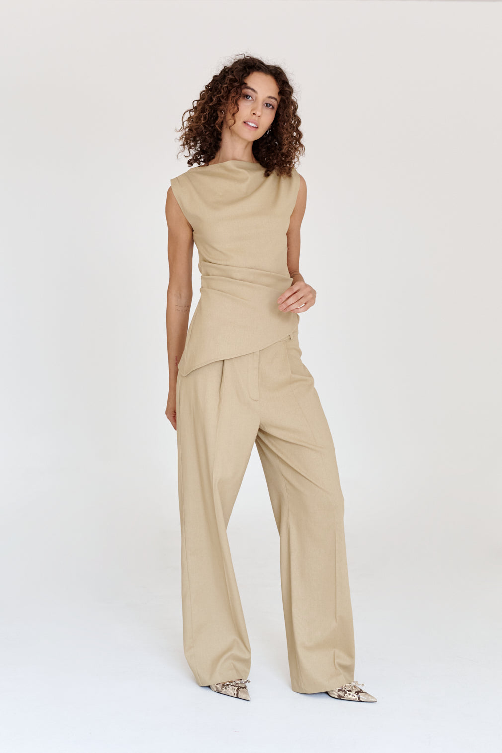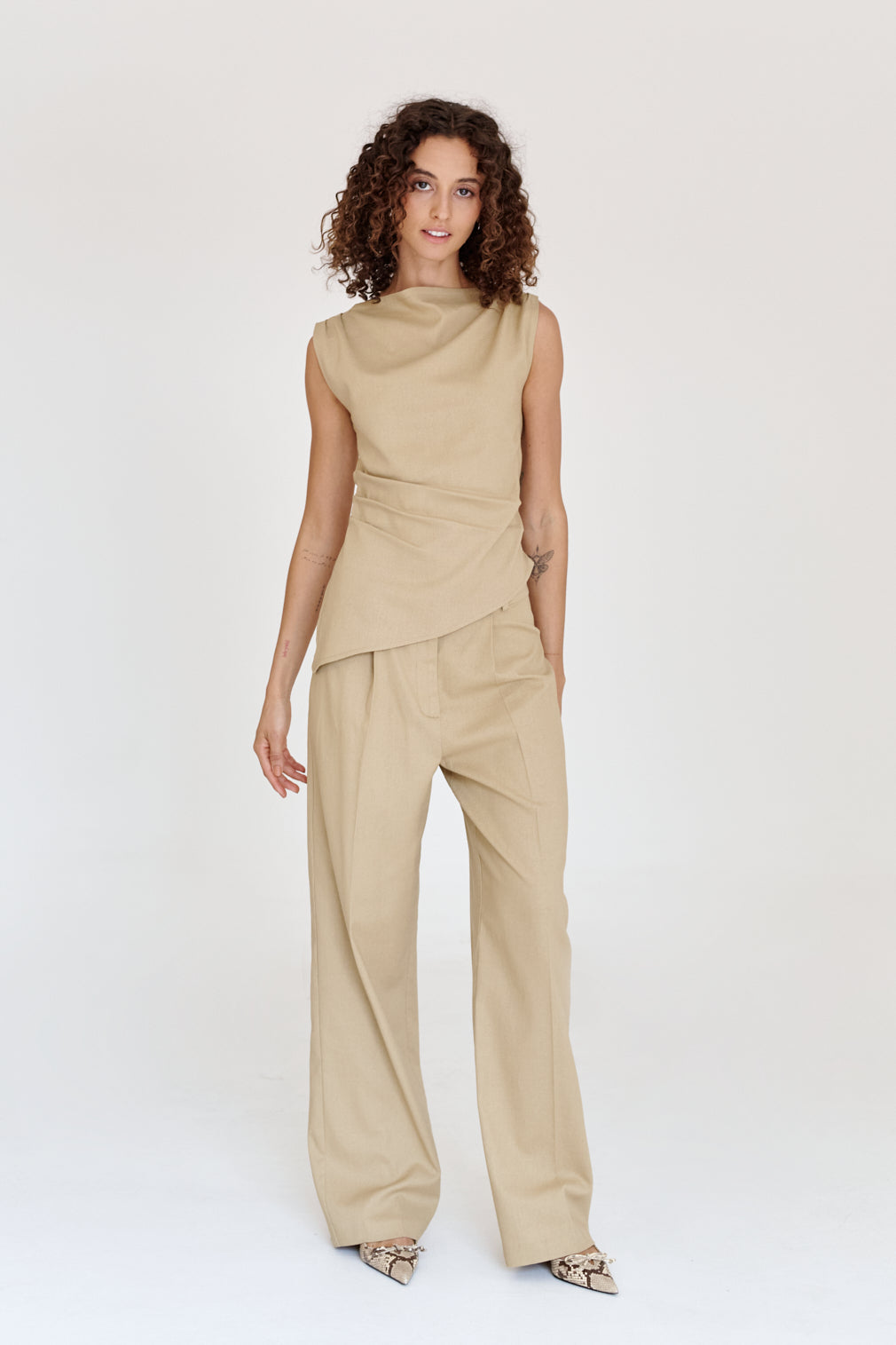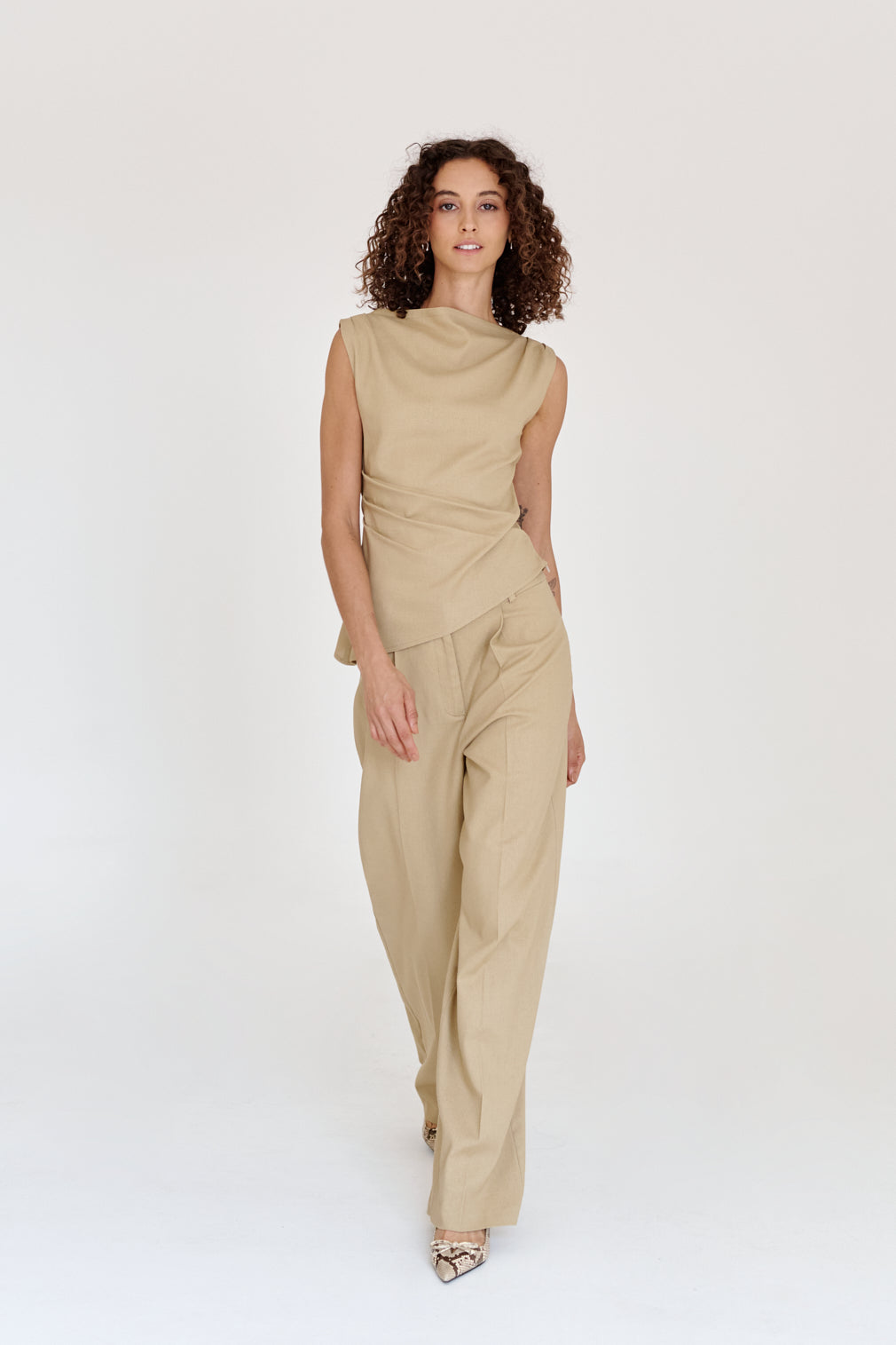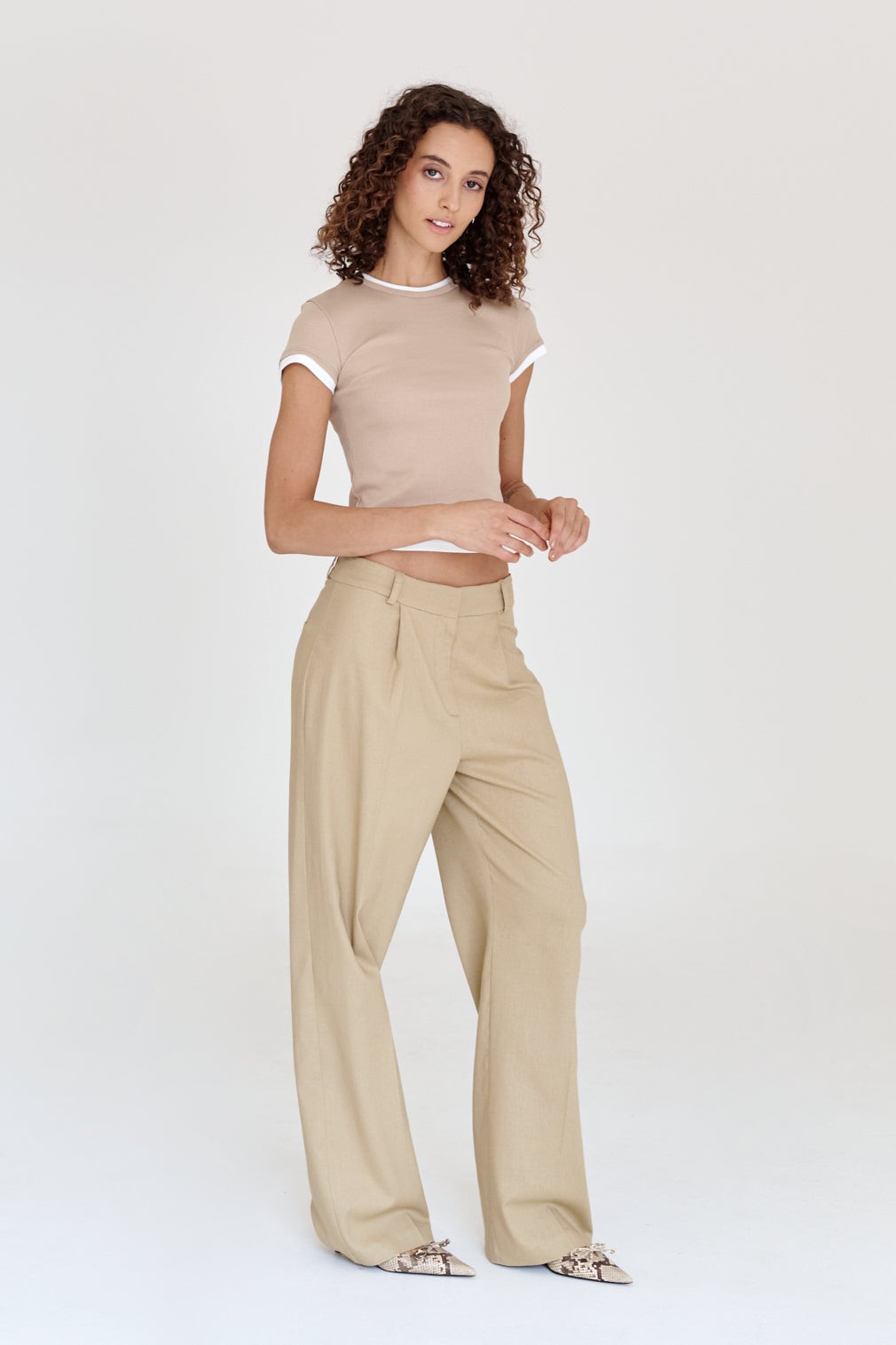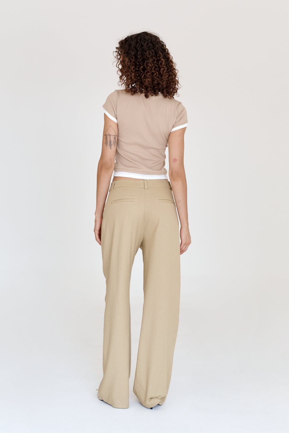 Straight-leg dress pants with a pronounced crease. Flowy fit.