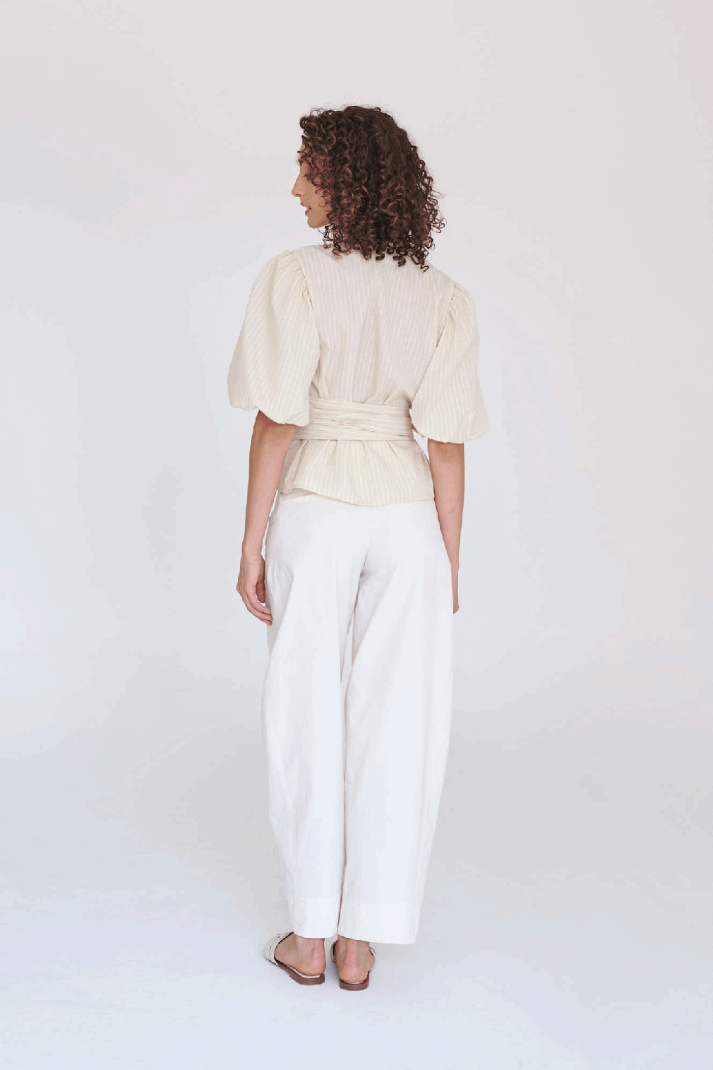 Baggy cargo pants with adjustable waist and ankle cinches. They feature leg slits for extra volume and pockets at the rear.