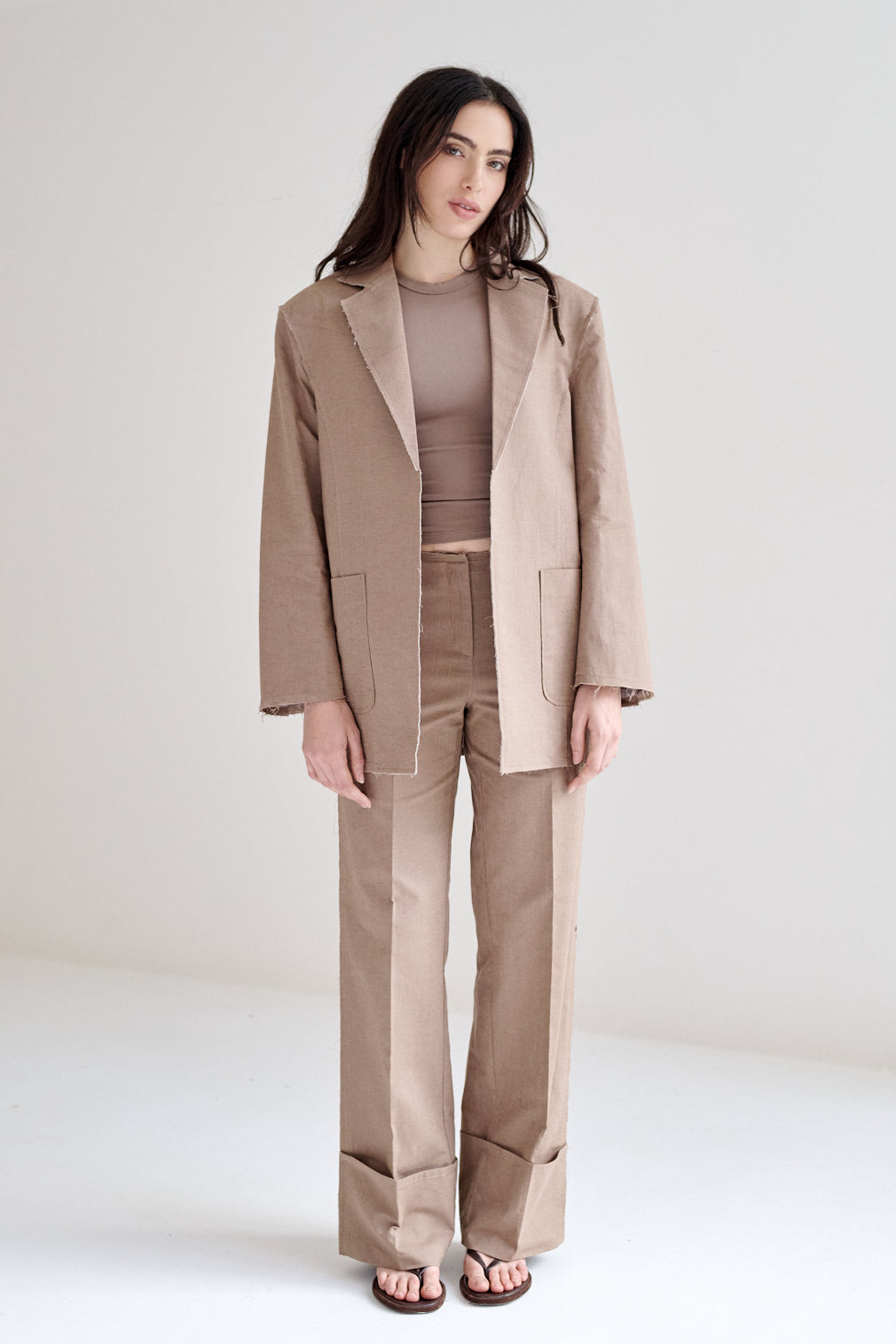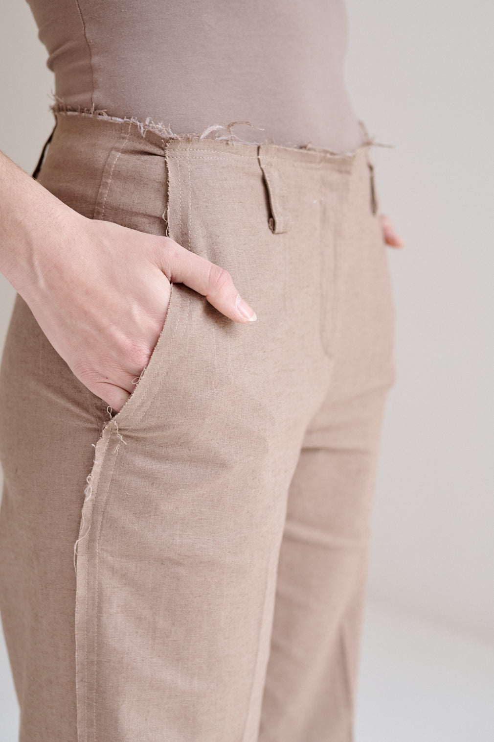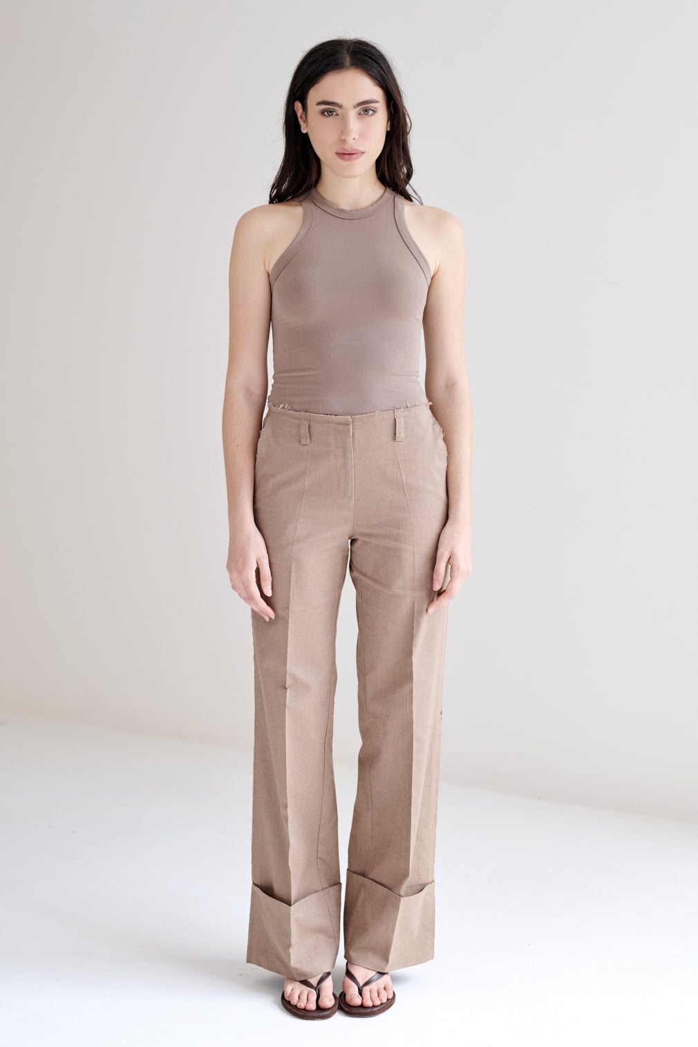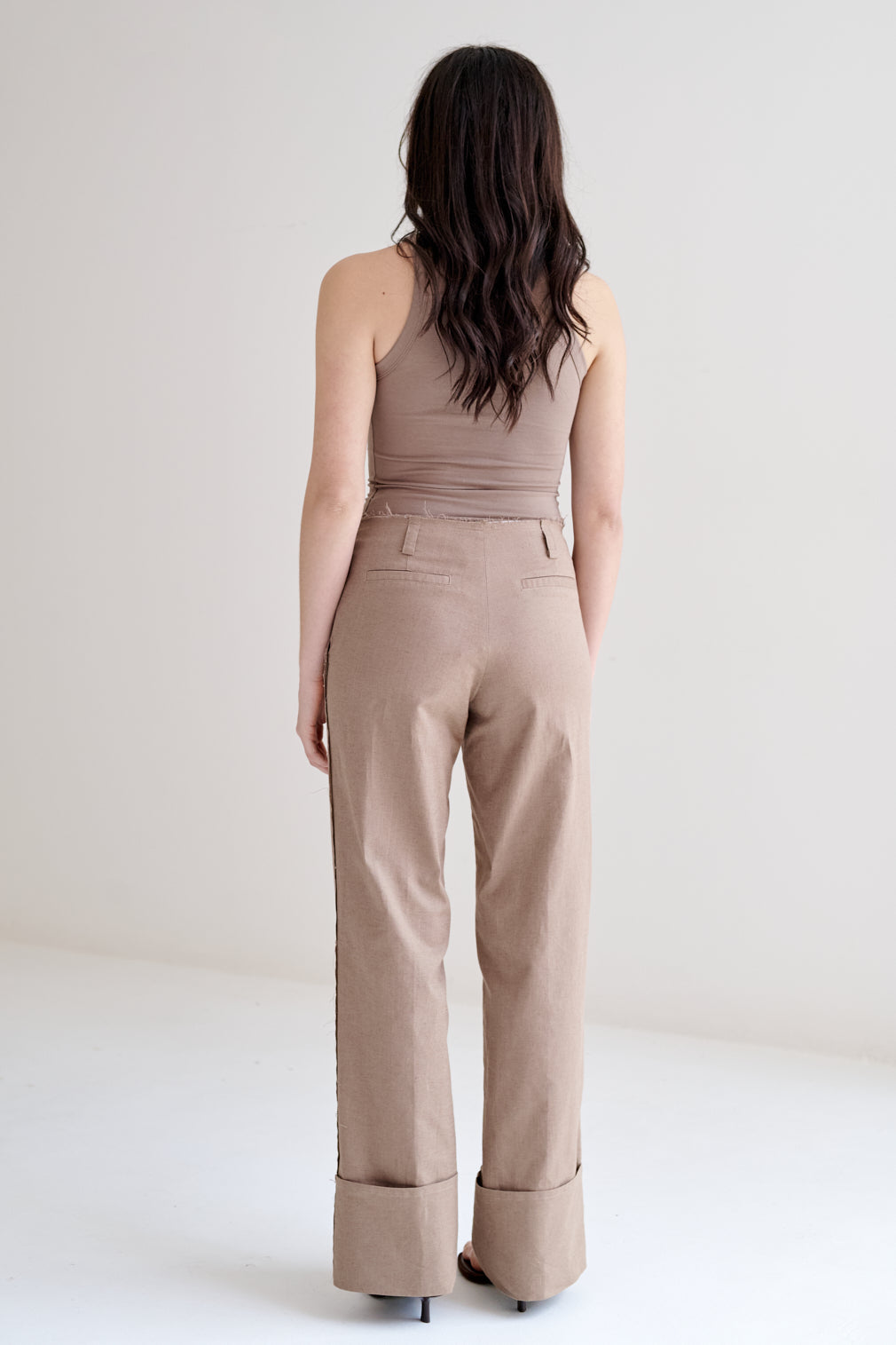 Pantalón wide leg con valenciana, bolsillos de vivo y detalle de bies en contraste