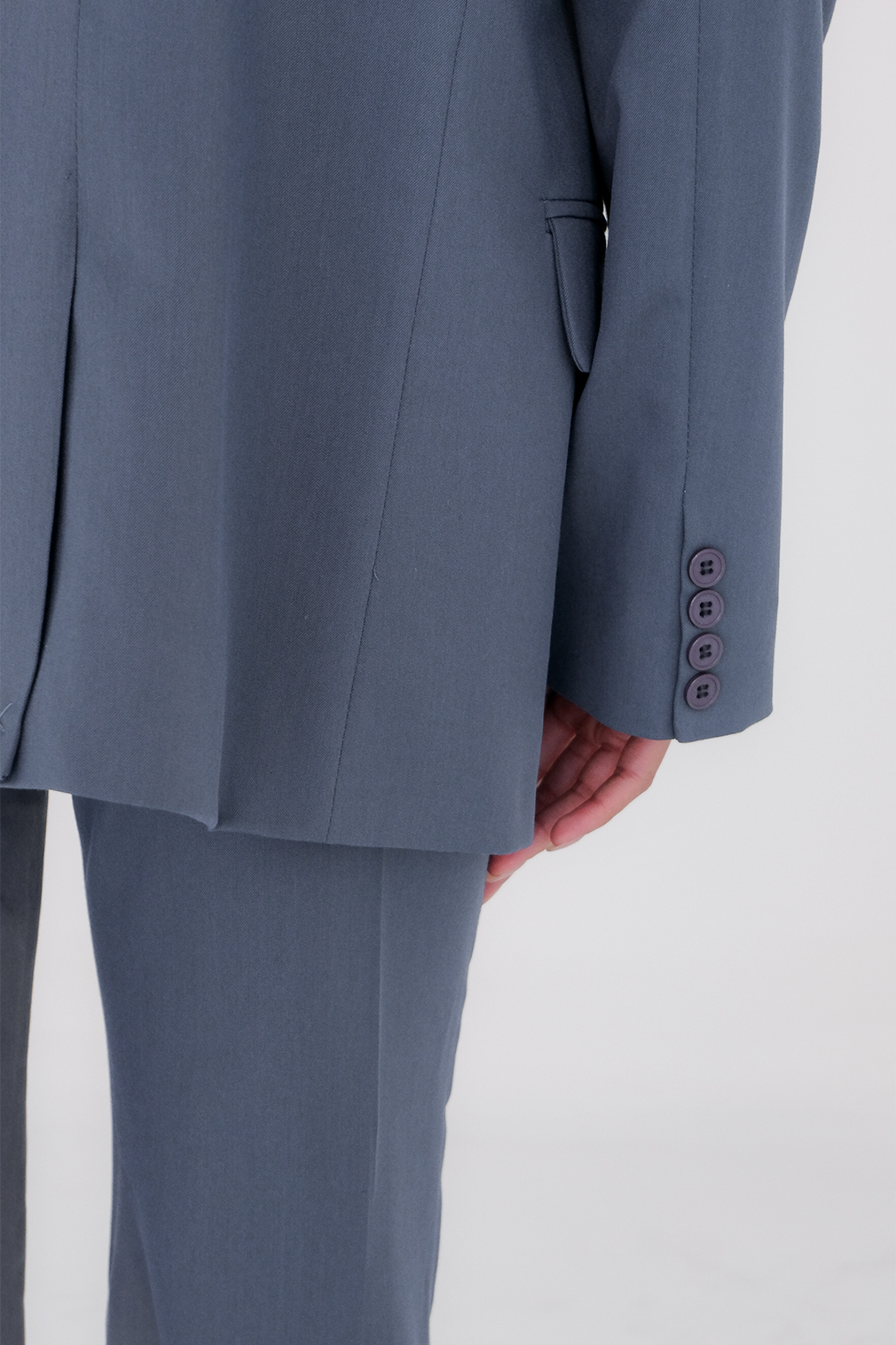 Double-breasted suit jacket, six buttons on the front.