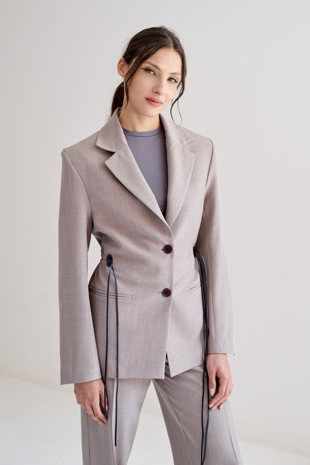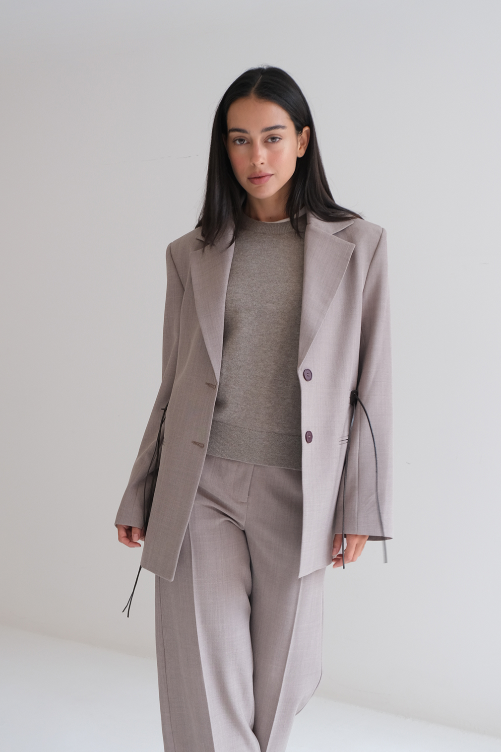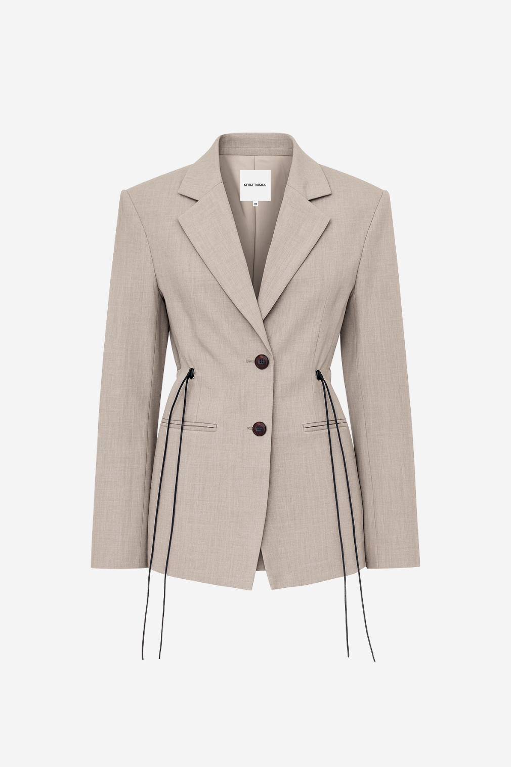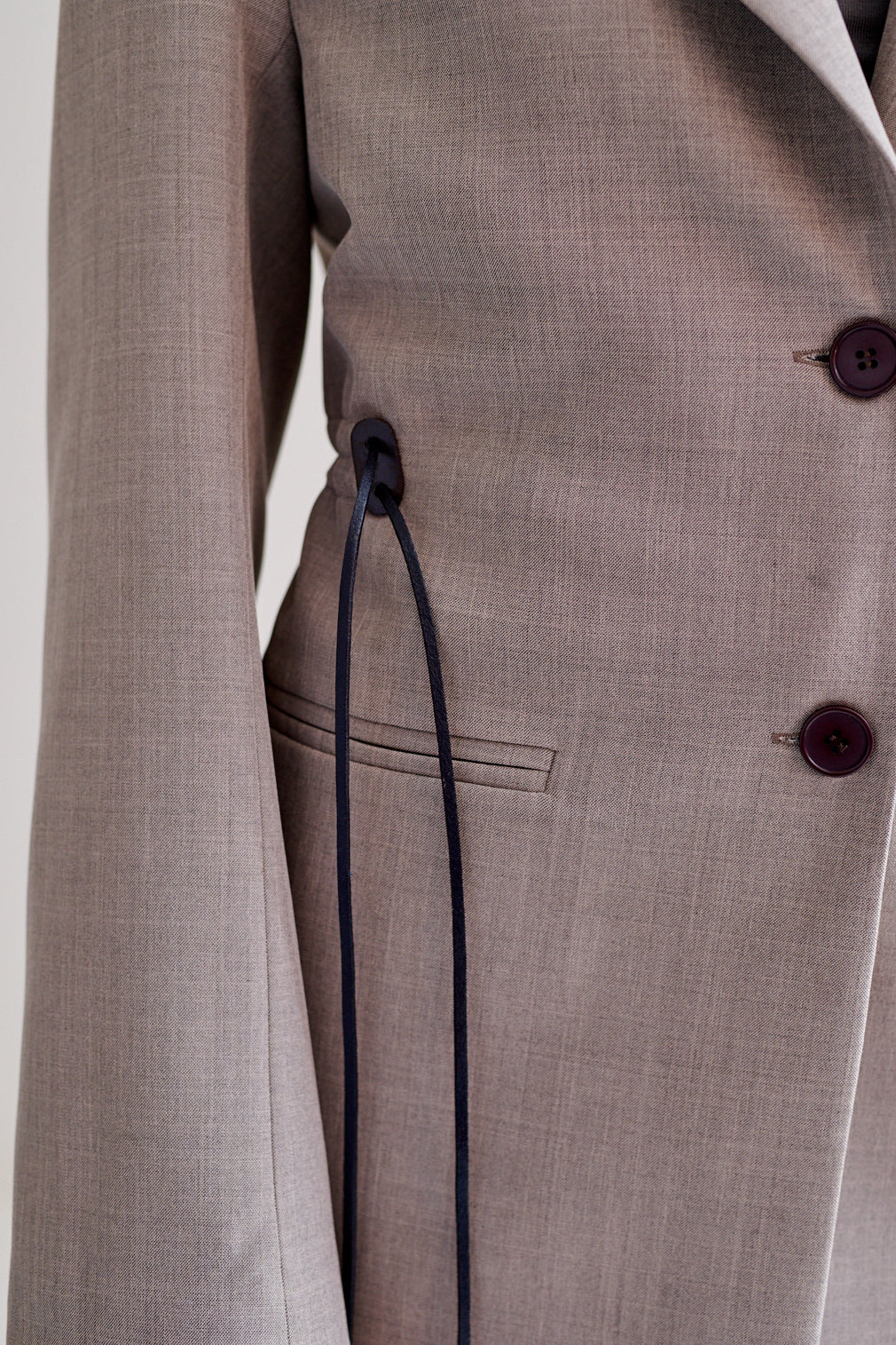Saco oversized con bolsillos de vivos y jareta de piel doble para enmarcar la silueta..