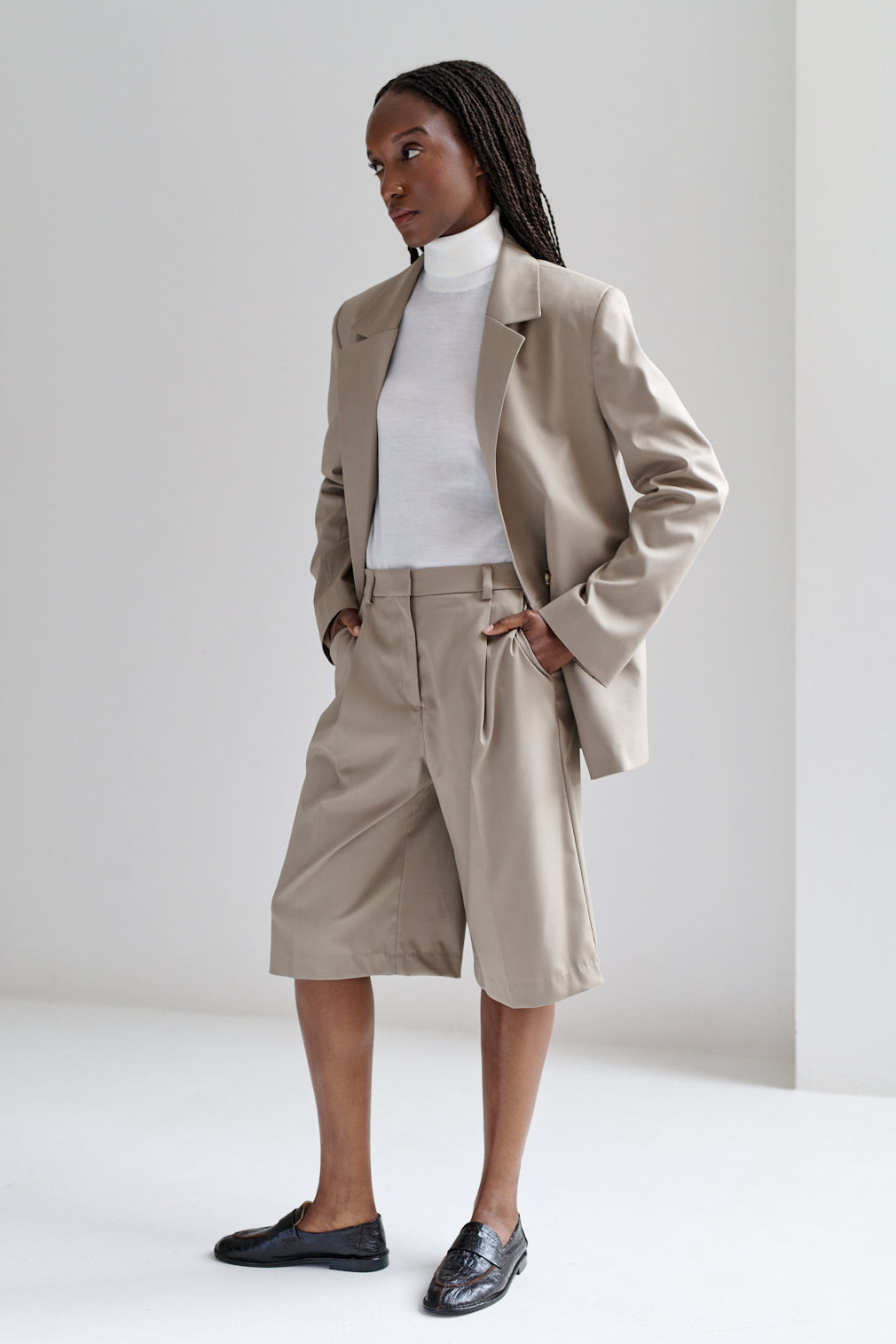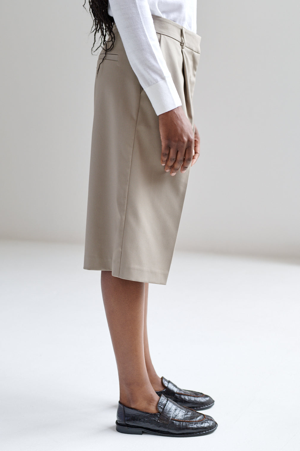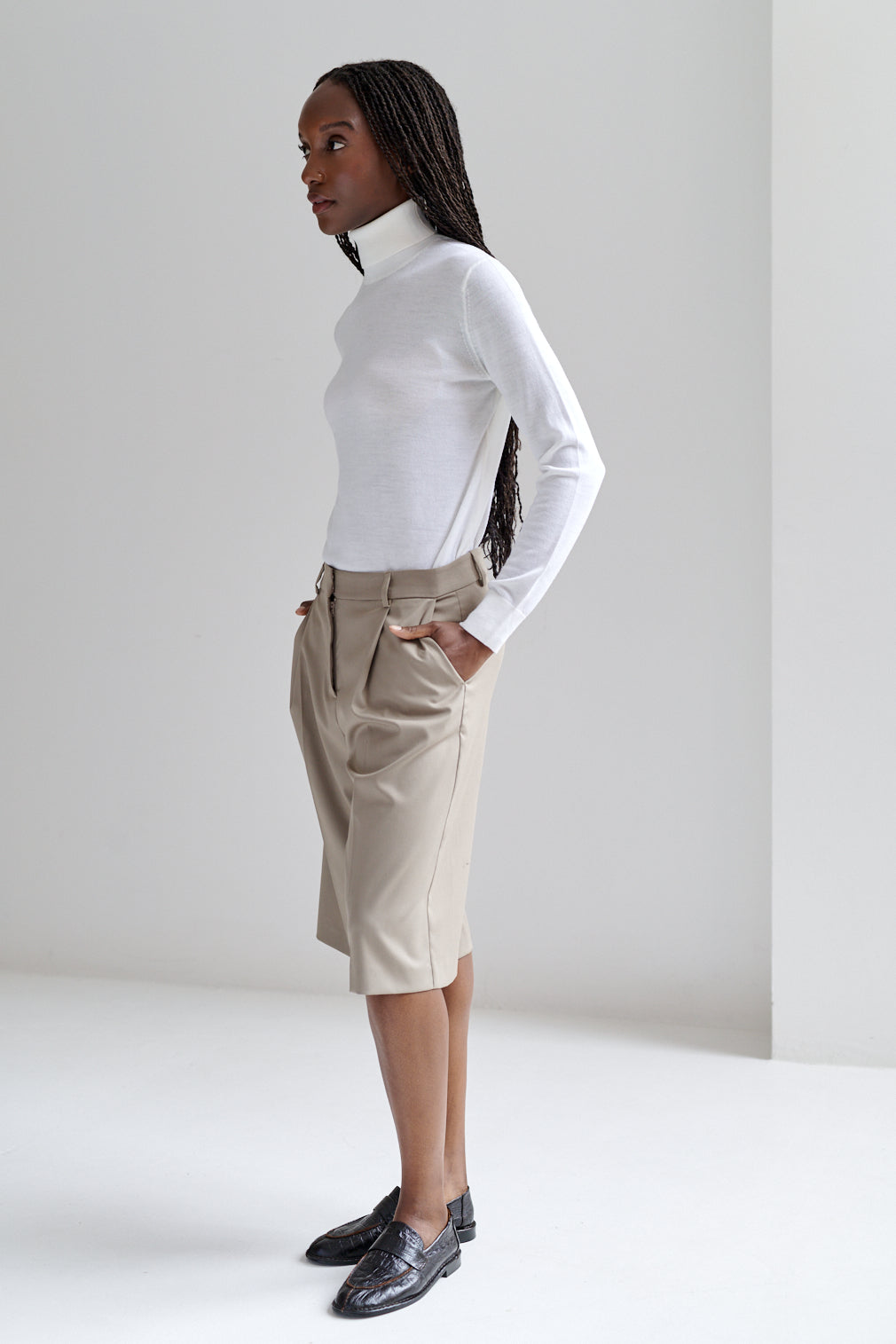 Bermuda pierna ancha con quiebre marcado y bolsillos laterales, largo abajo de la rodilla.