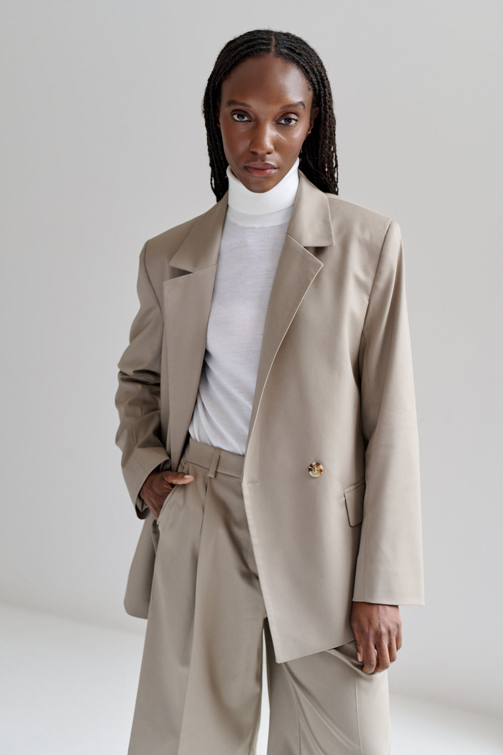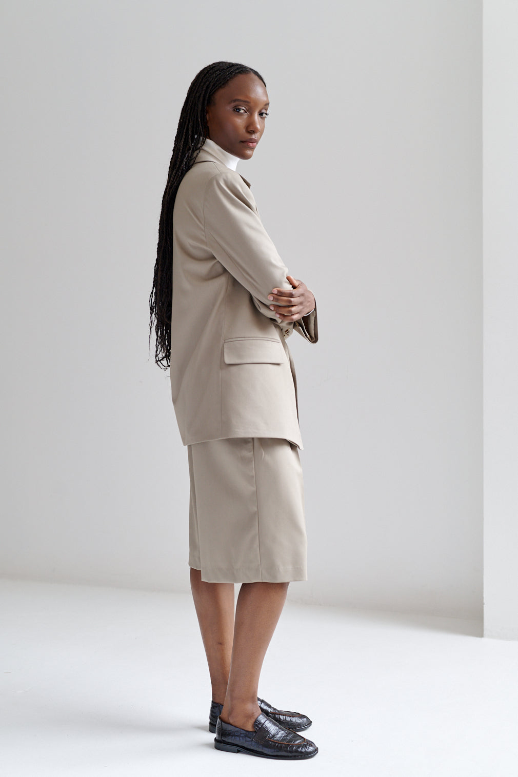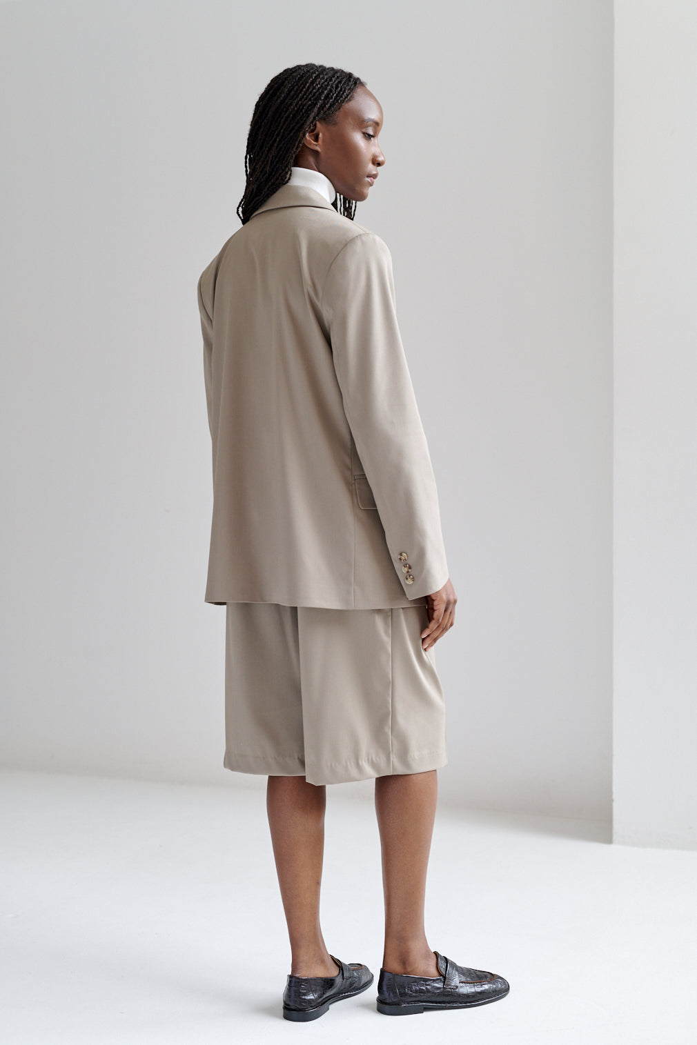 Bermuda pierna ancha con quiebre marcado y bolsillos laterales, largo abajo de la rodilla.