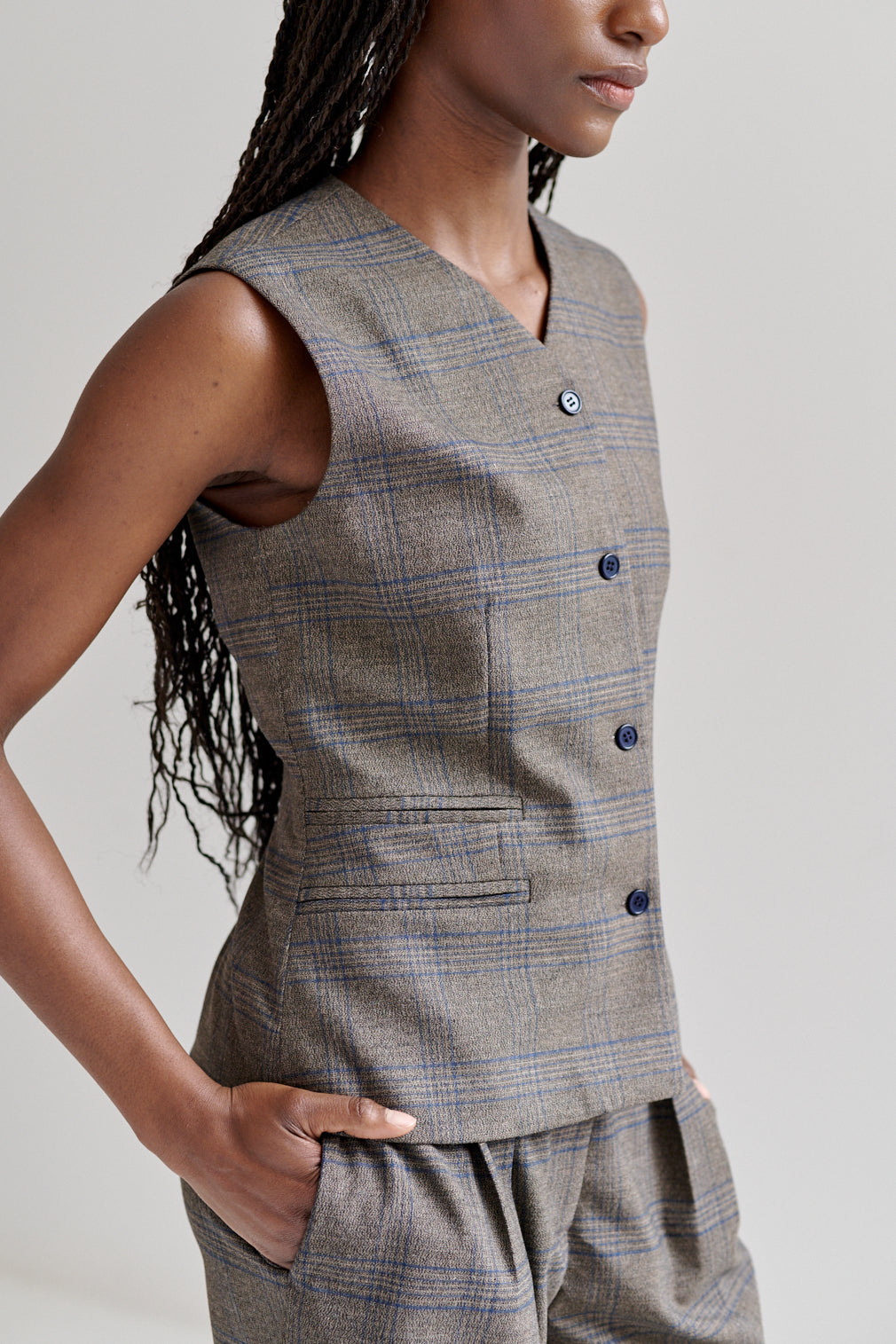Chaleco de vesitir con doble ajustador en parte trasera y doble bolsas de vivo en el delantero.
