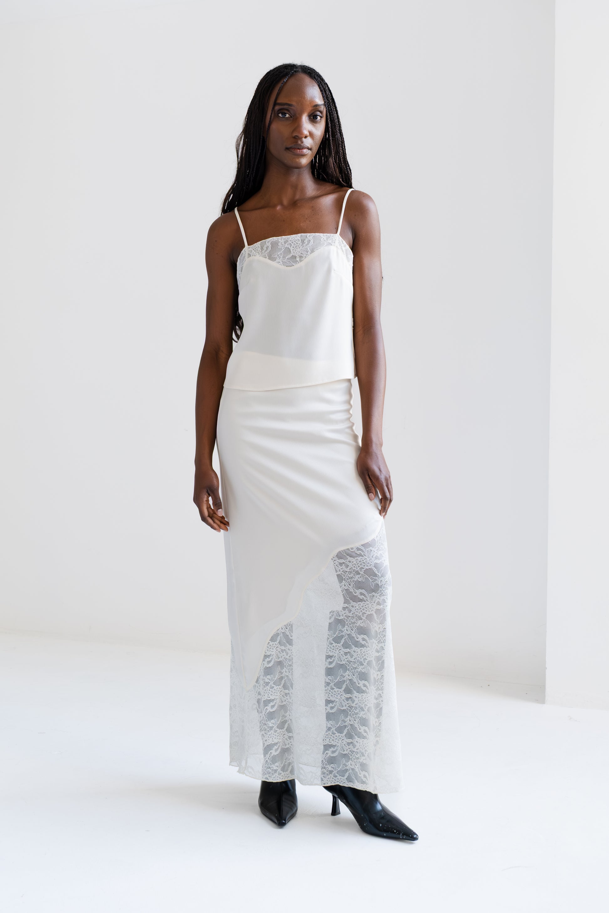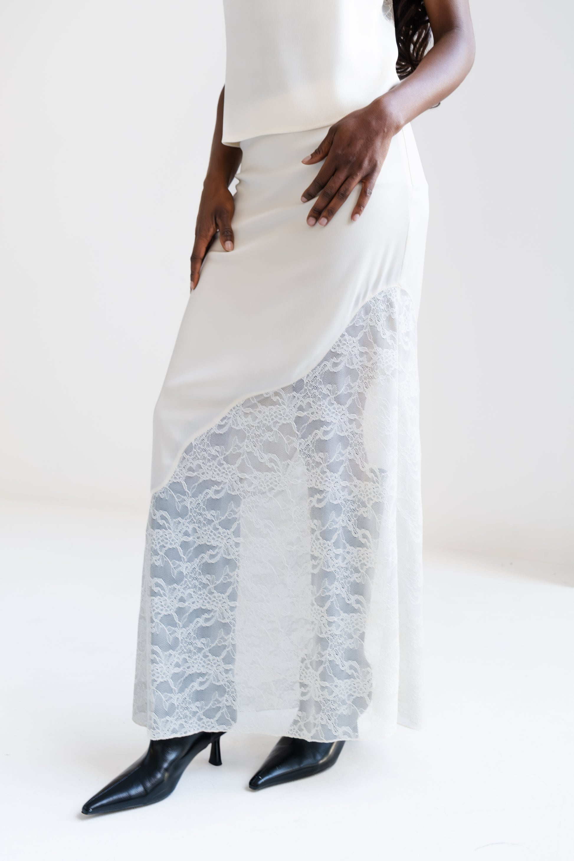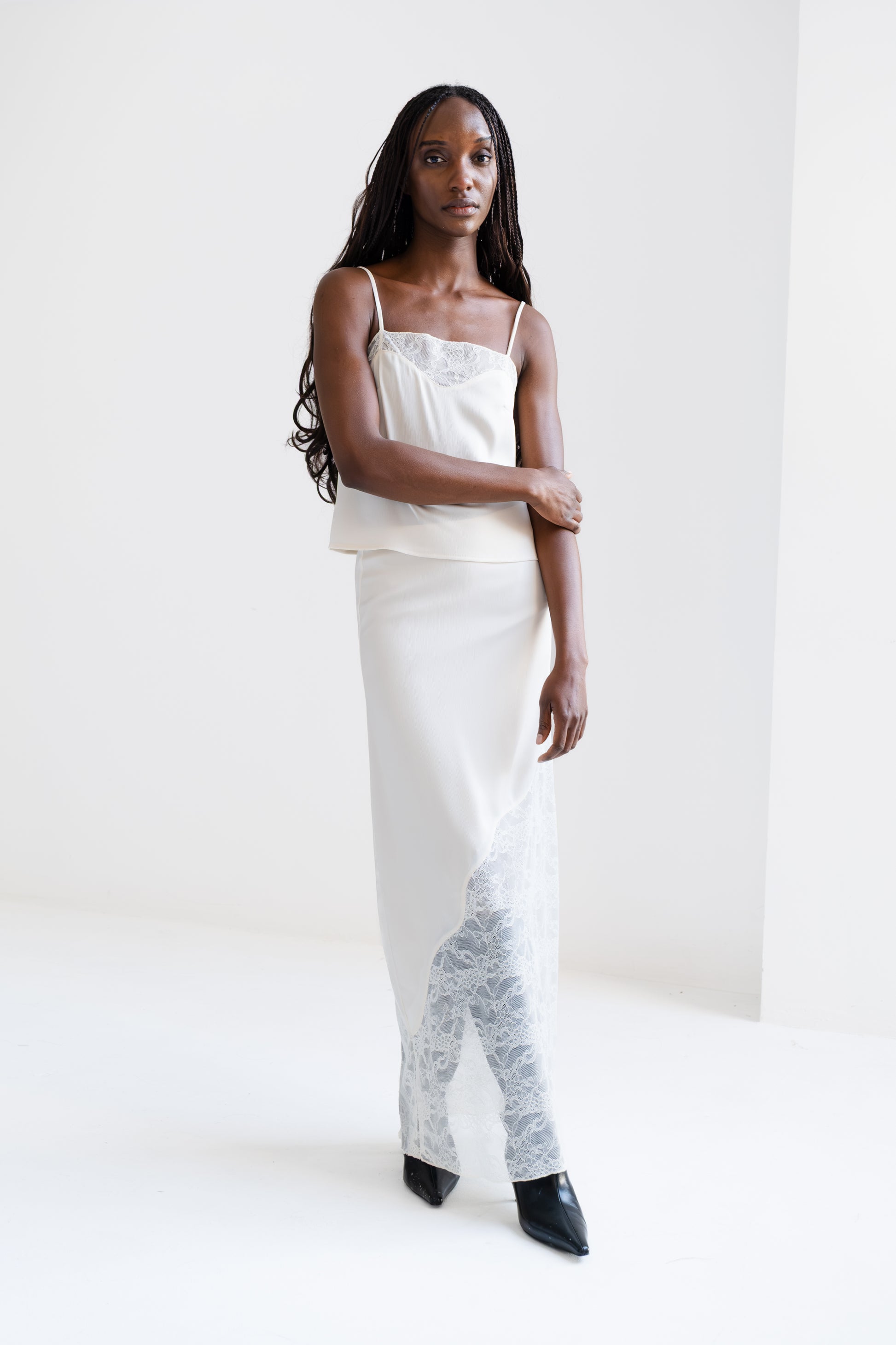 Falda recta midi con panel de encaje al tono y curva orgánica que acentúa la caída.