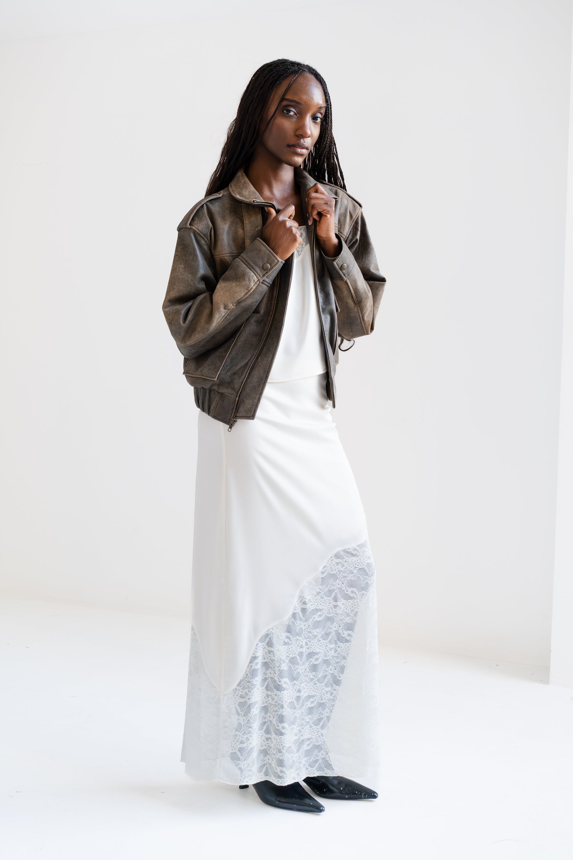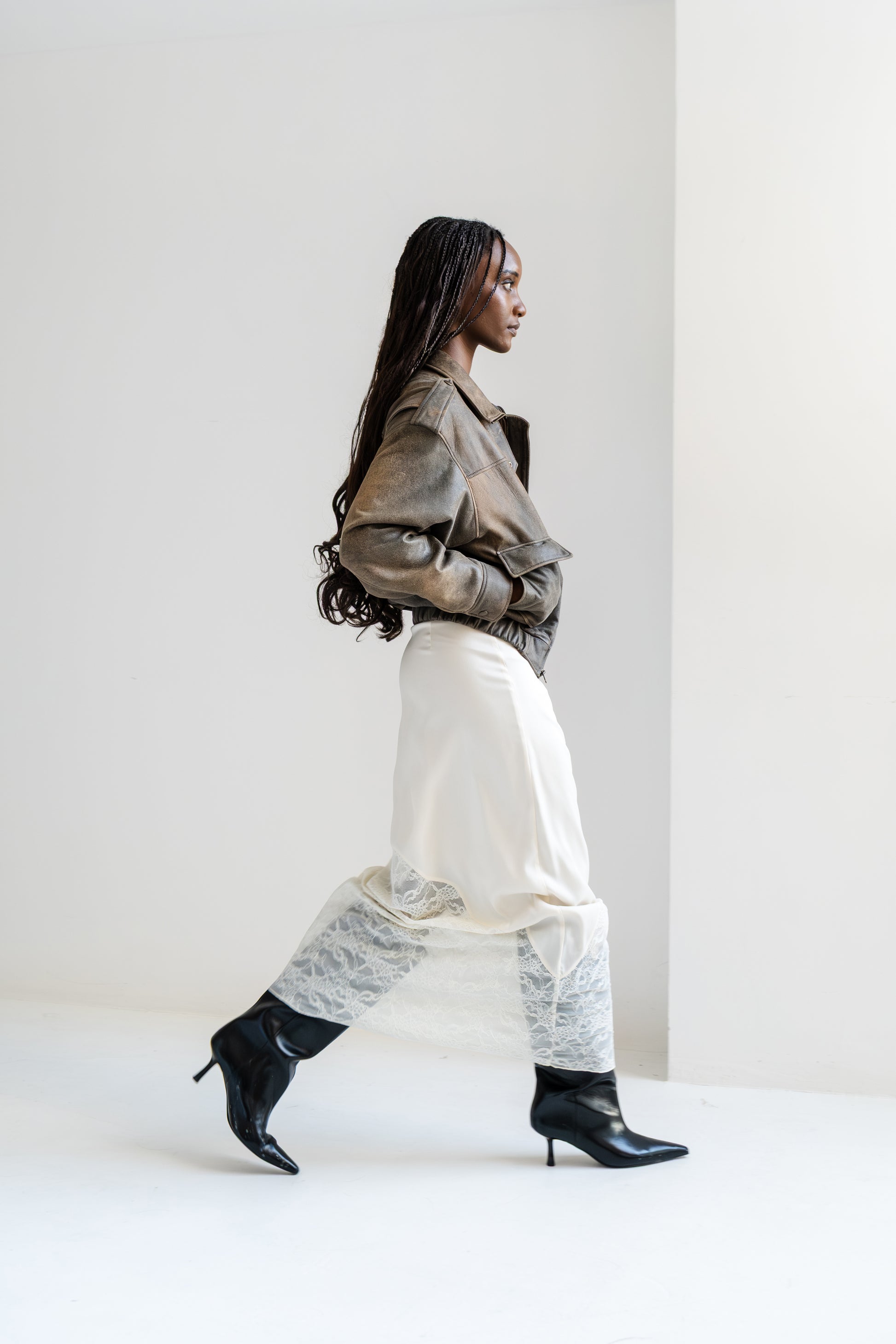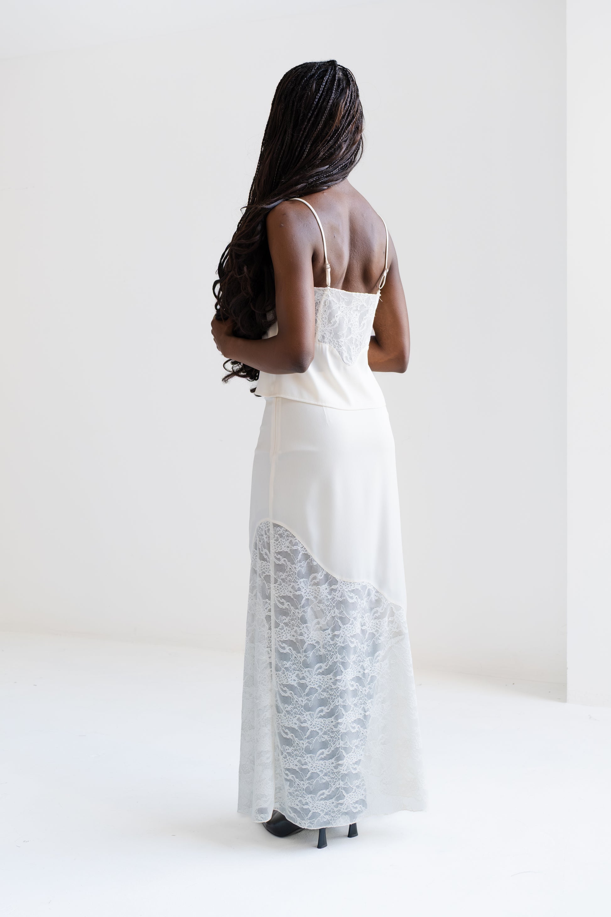 Falda recta midi con panel de encaje al tono y curva orgánica que acentúa la caída.