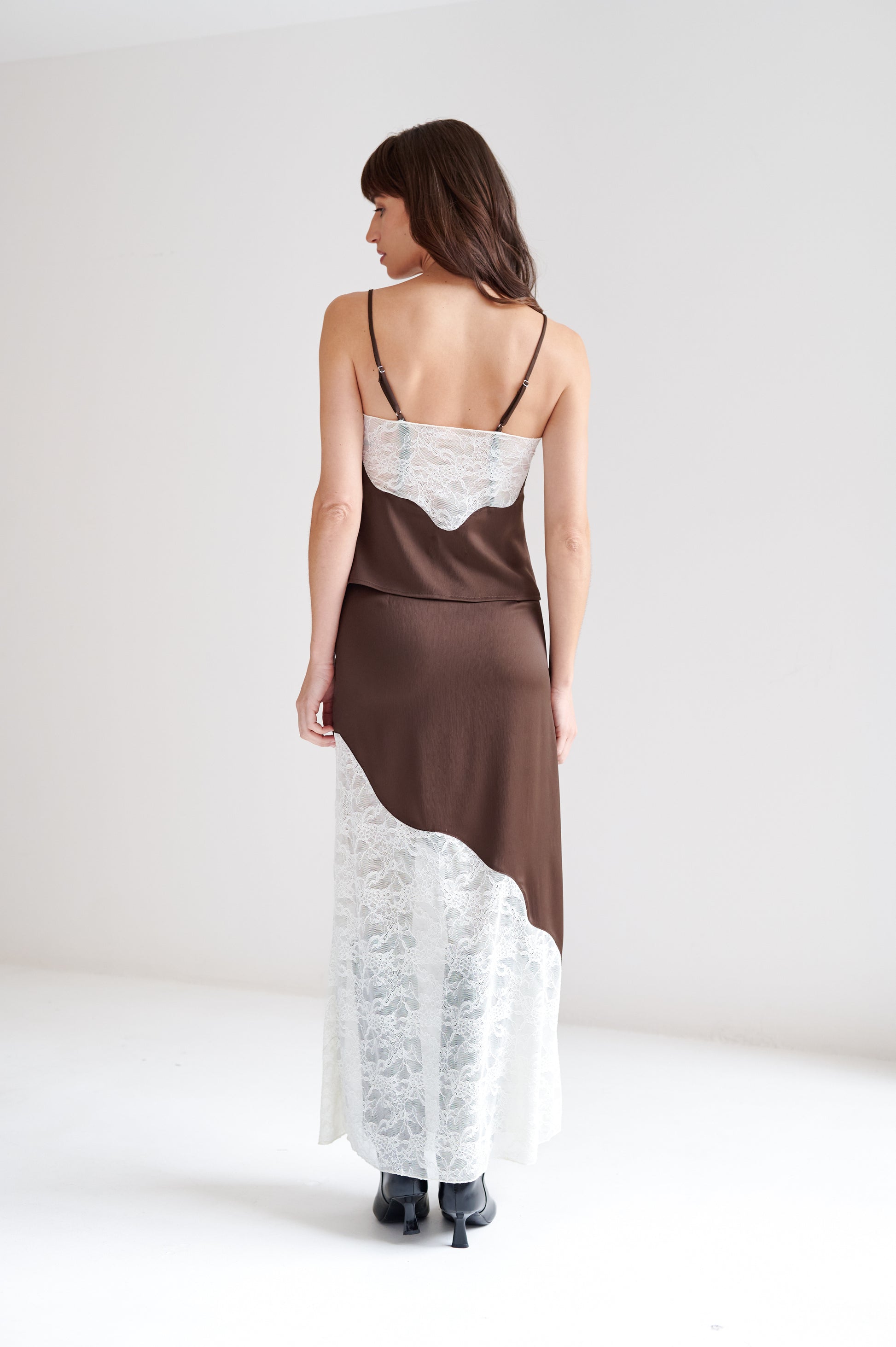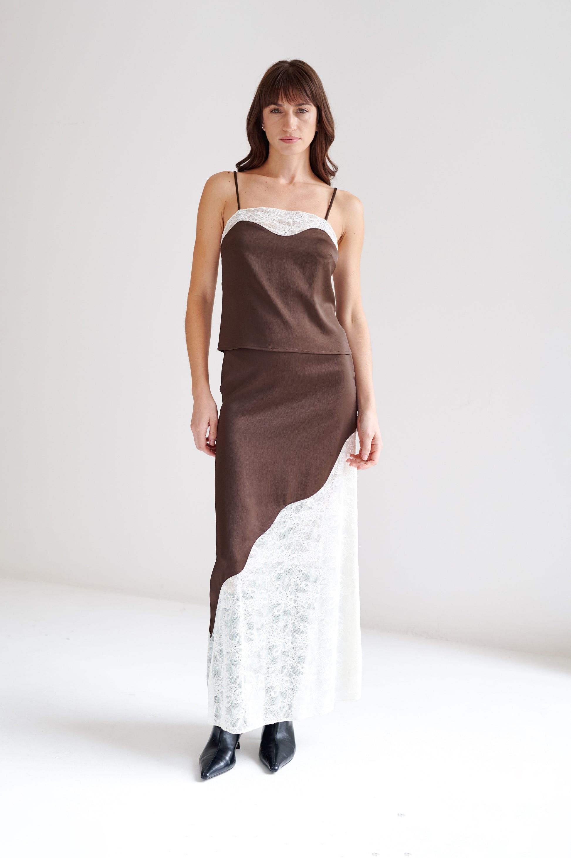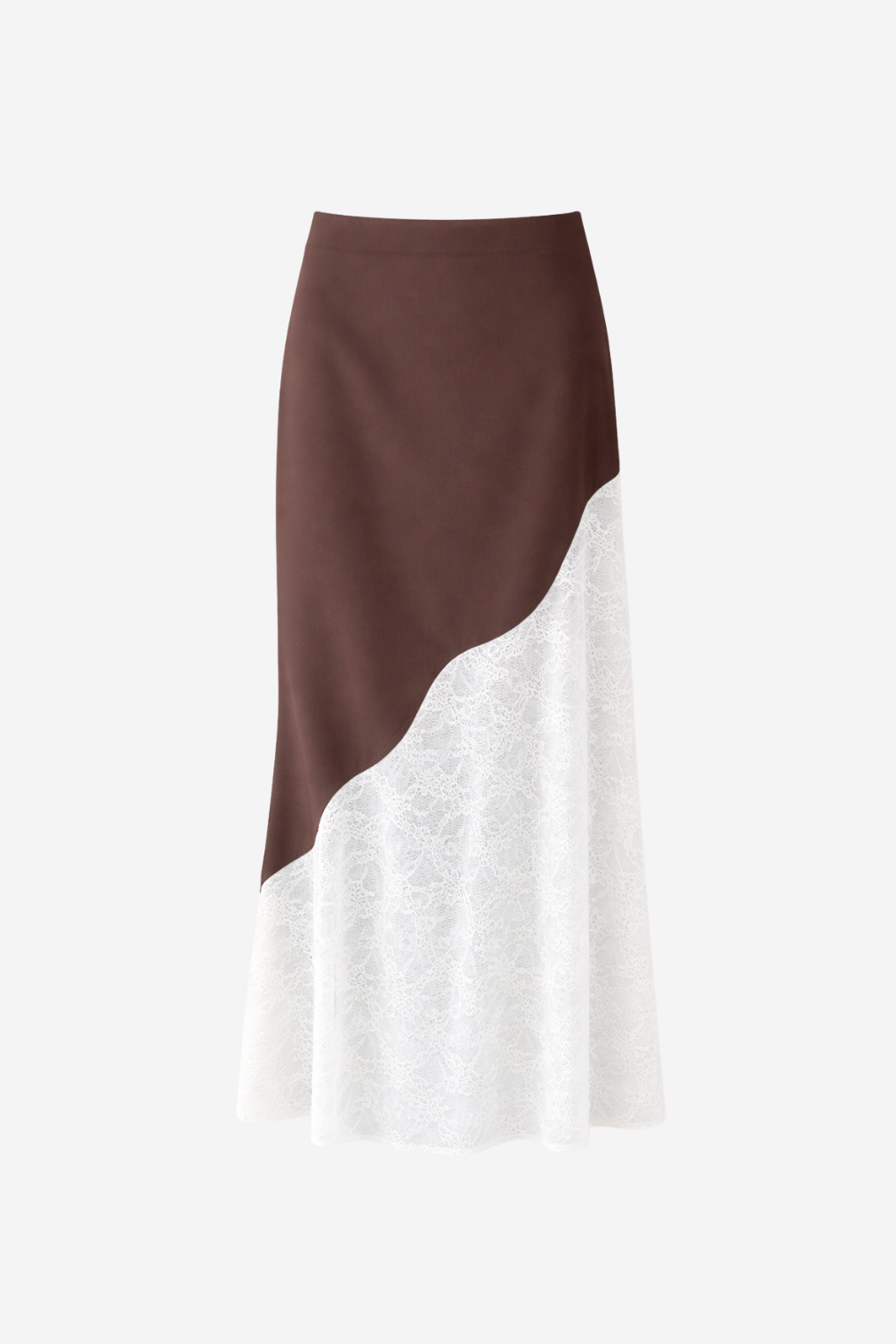 Falda recta midi con panel de encaje al tono y curva orgánica que acentúa la caída.