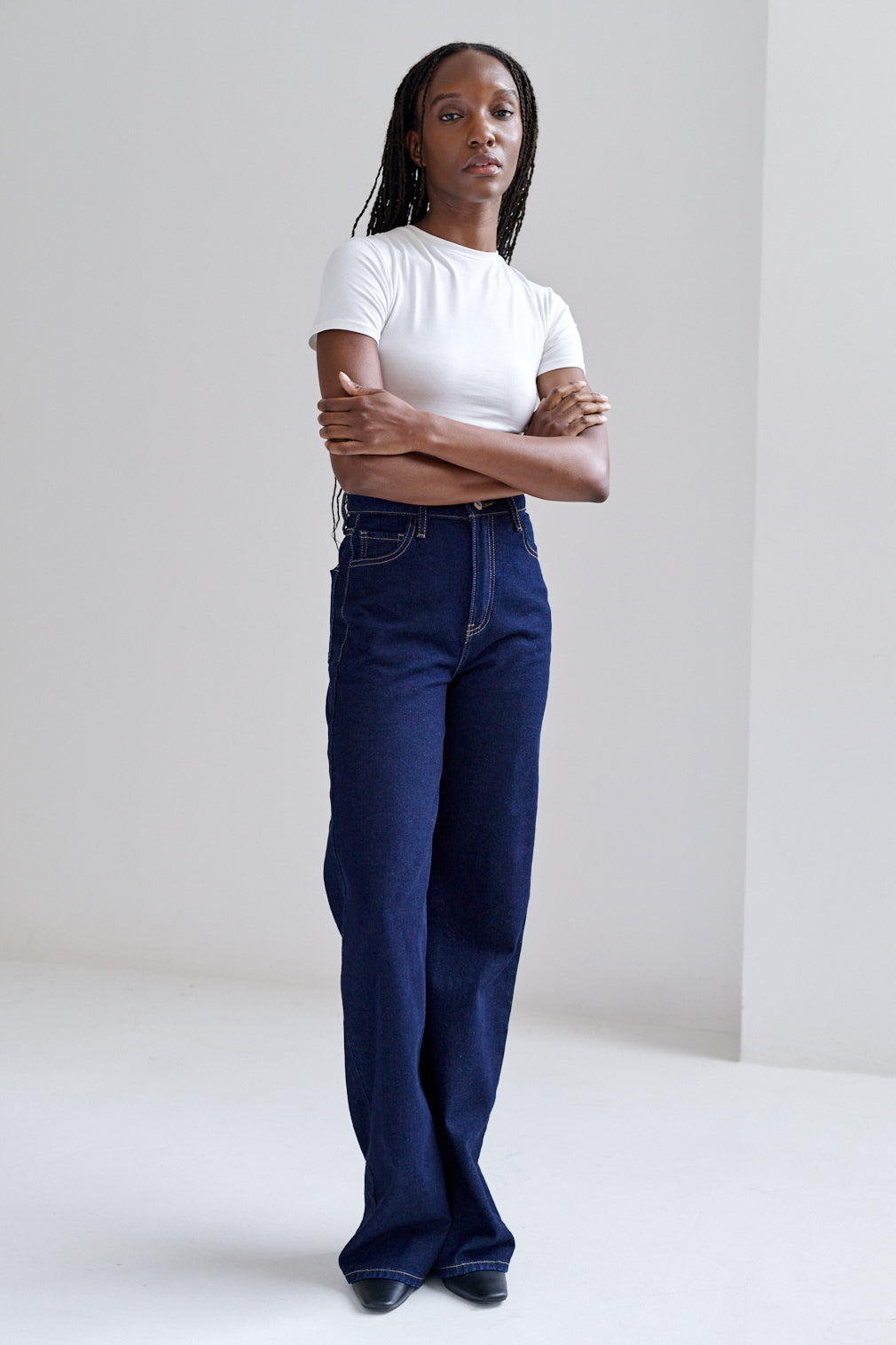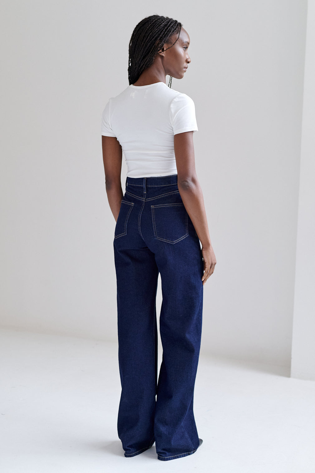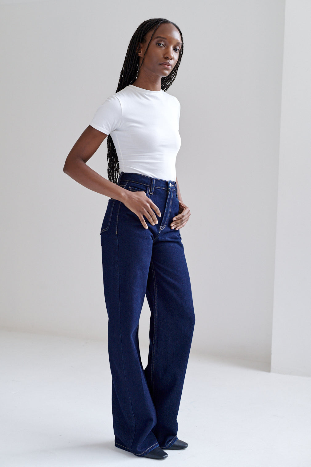 Jeans de corte recto y tiro alto con lavado claro de acabado vintage. Fit limpio y estructurado, con costuras reforzadas y bolsillos clásicos.