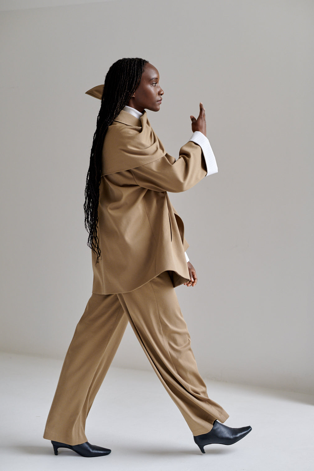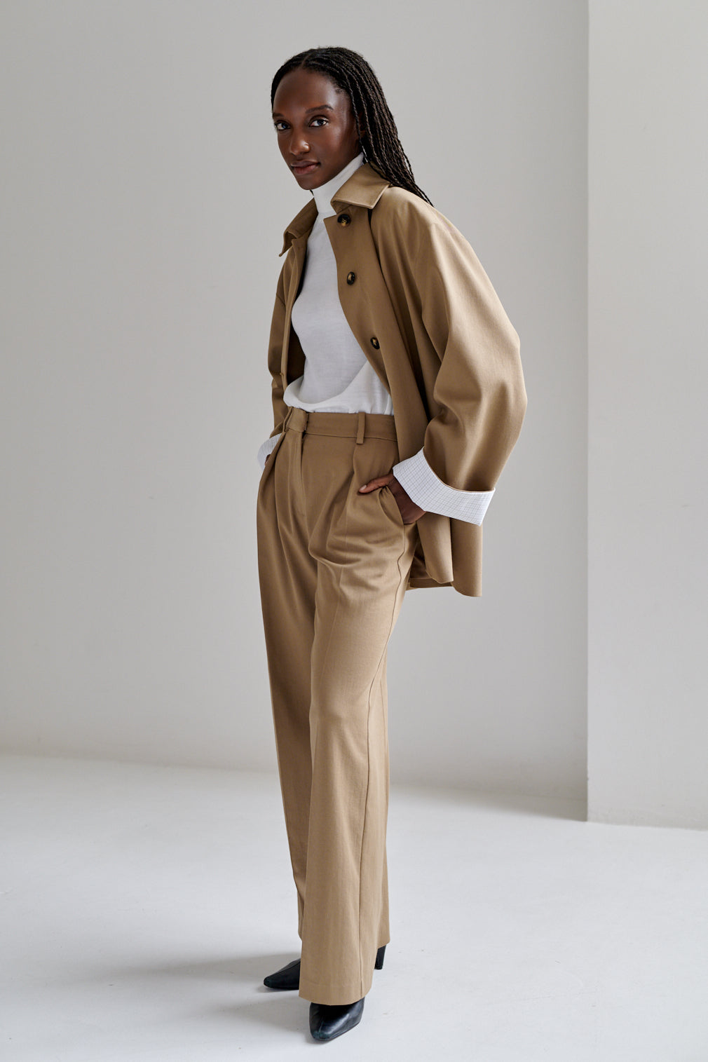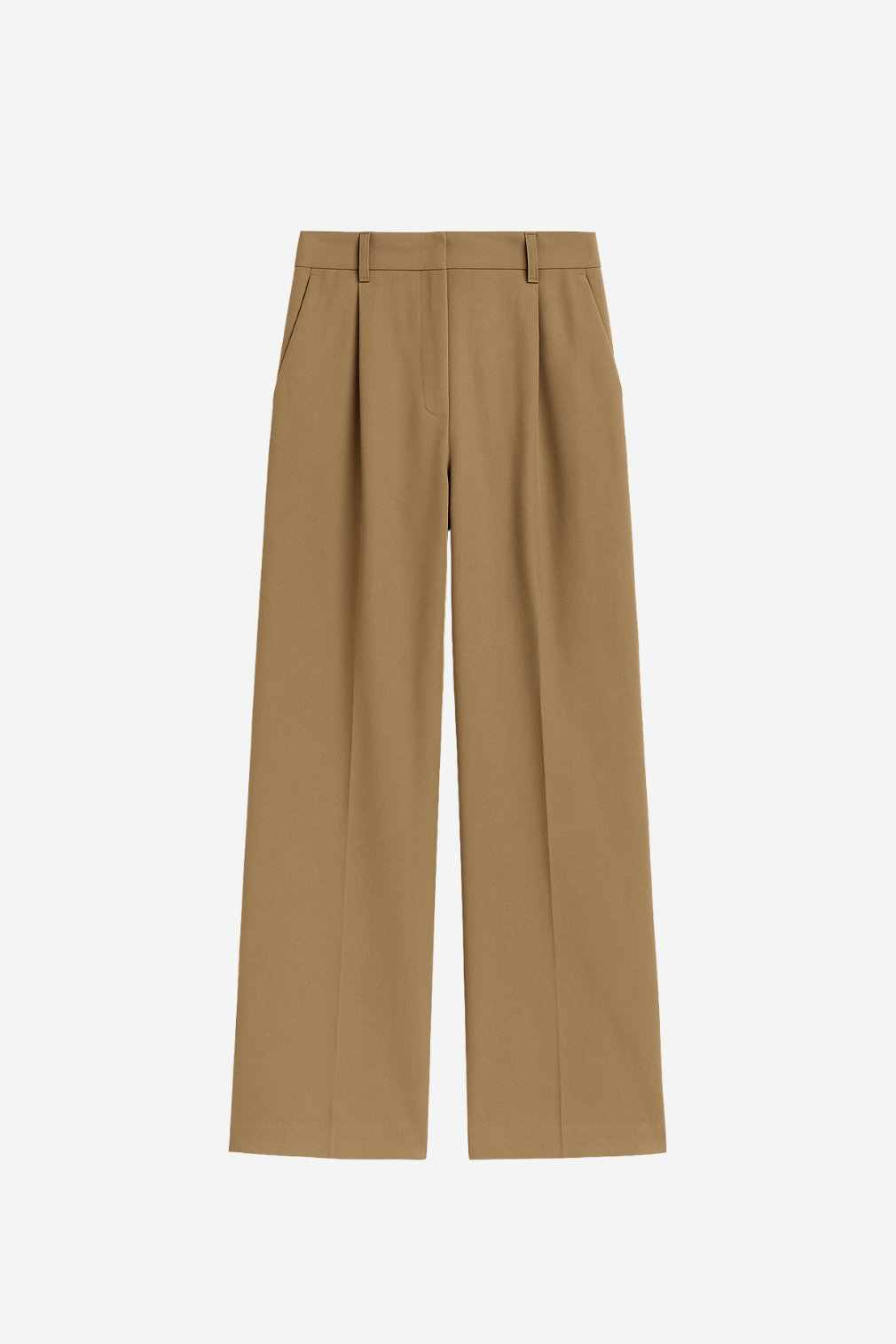 Pantalón de tiro medio con pinzas hacia el interior, corte recto y estructura limpia. Bolsas laterales y cierre oculto.