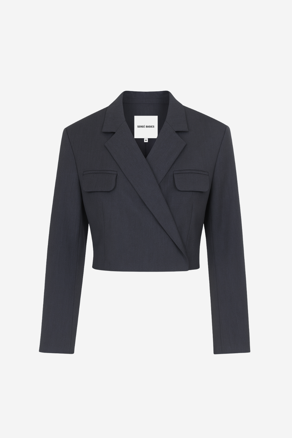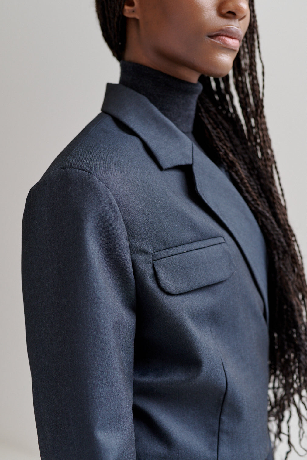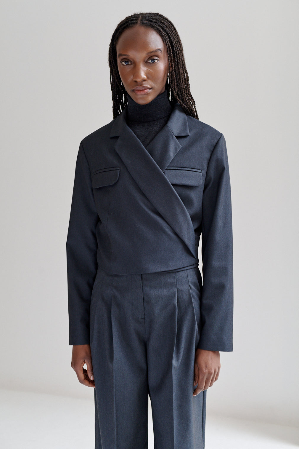 Saco corto de corte estructurado con cruce envolvente al frente, ajuste trasero con botones.
