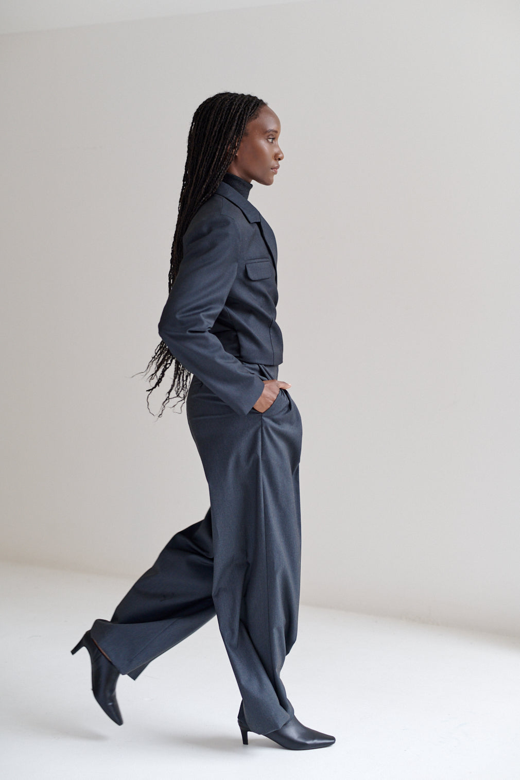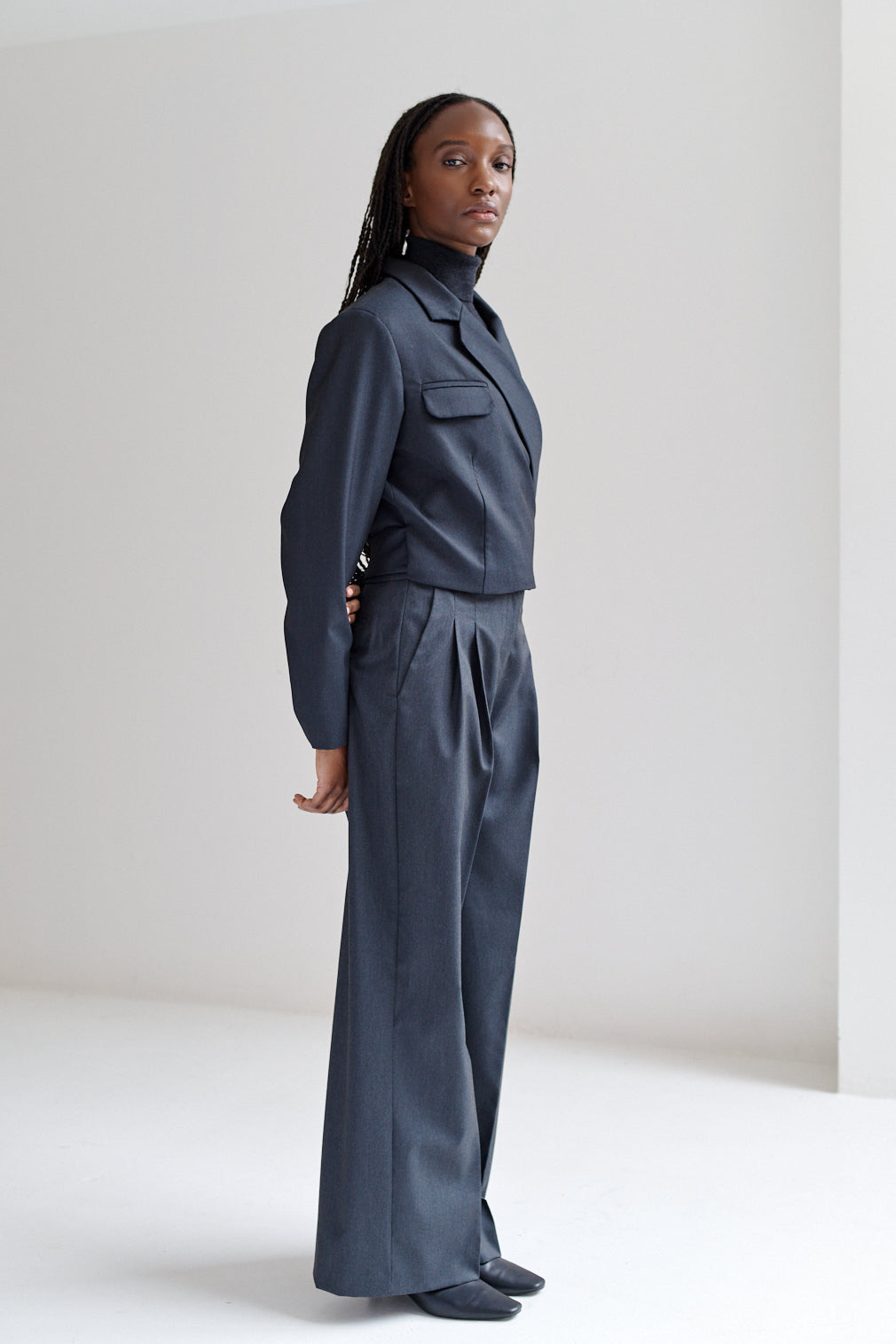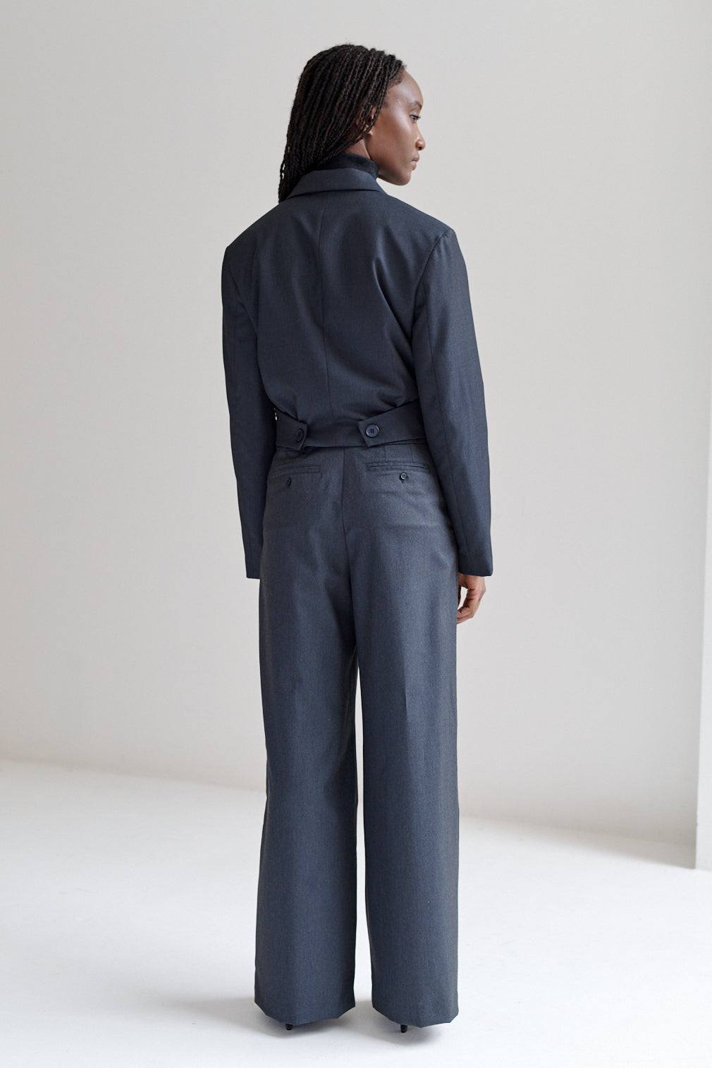 Saco corto de corte estructurado con cruce envolvente al frente, ajuste trasero con botones.