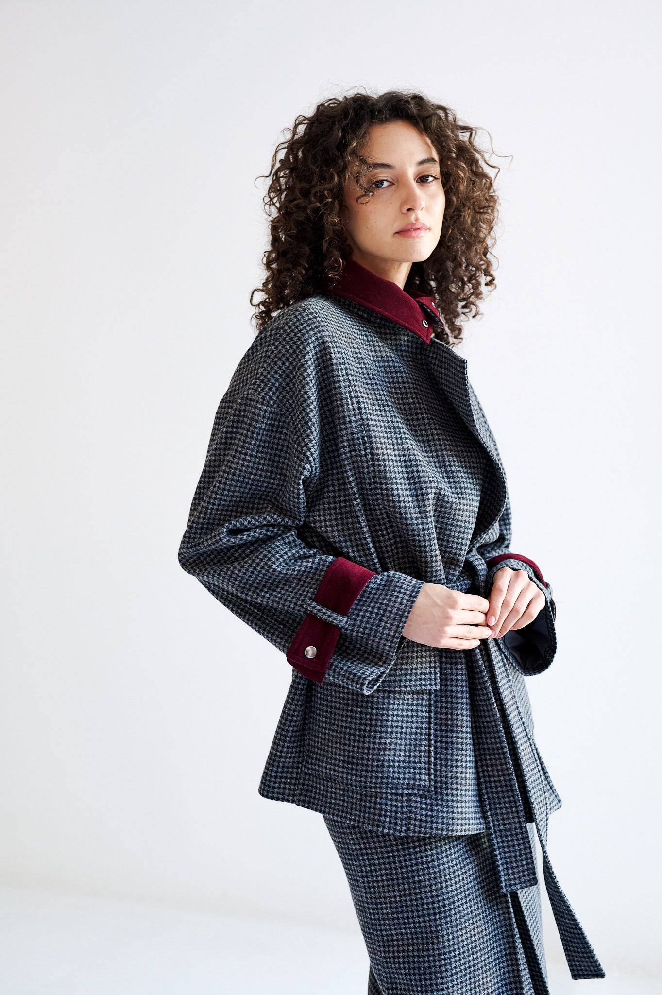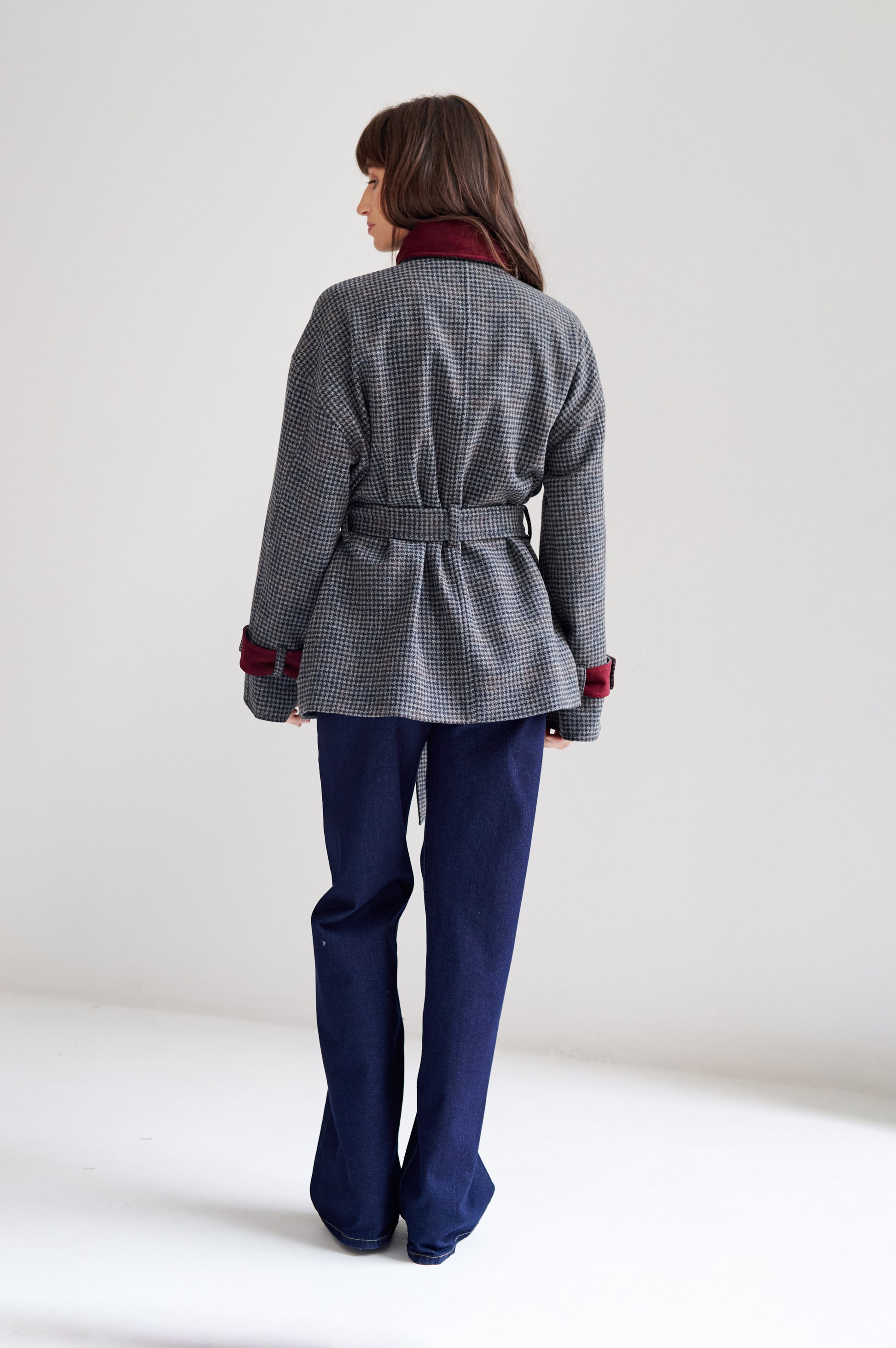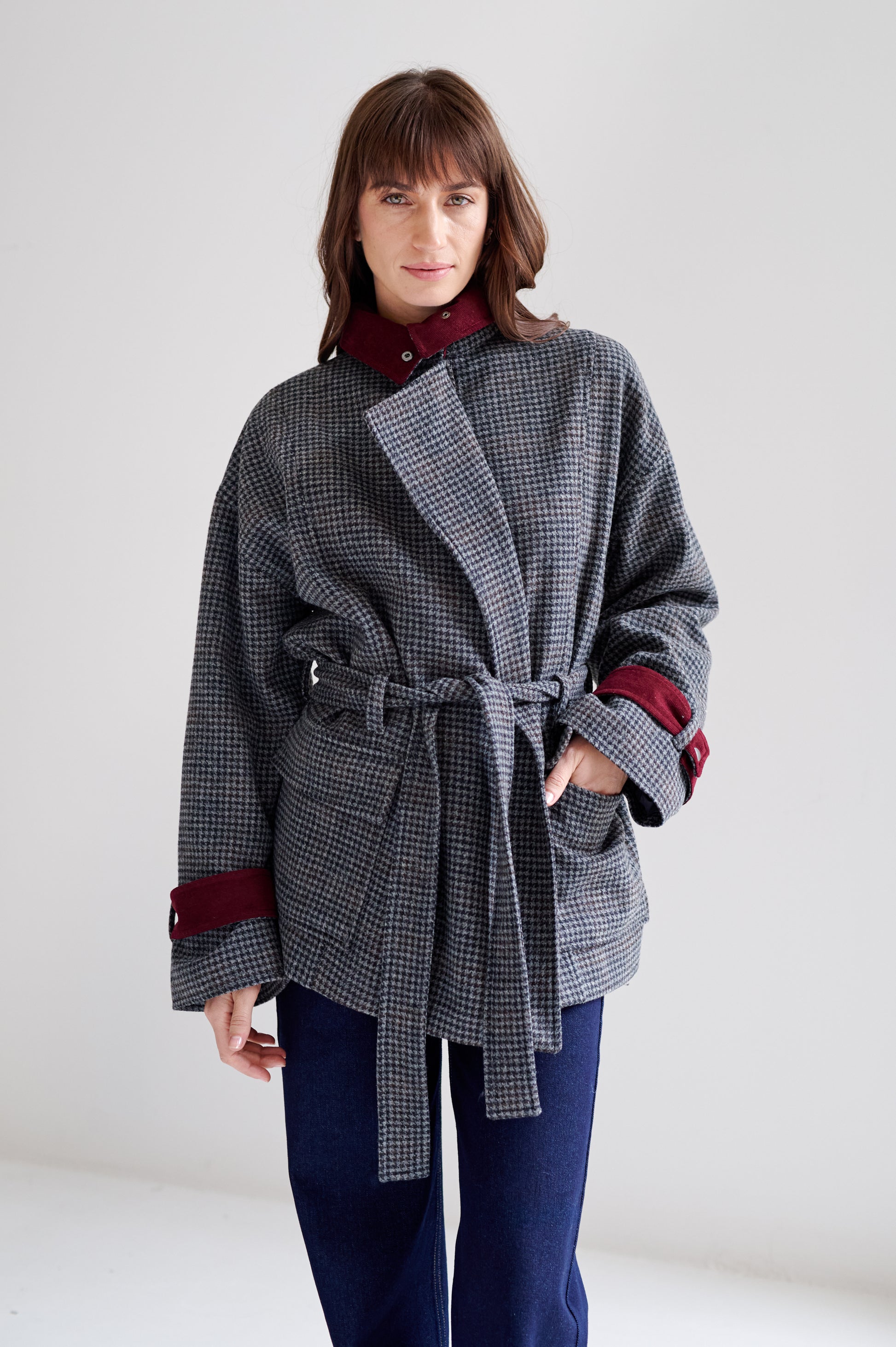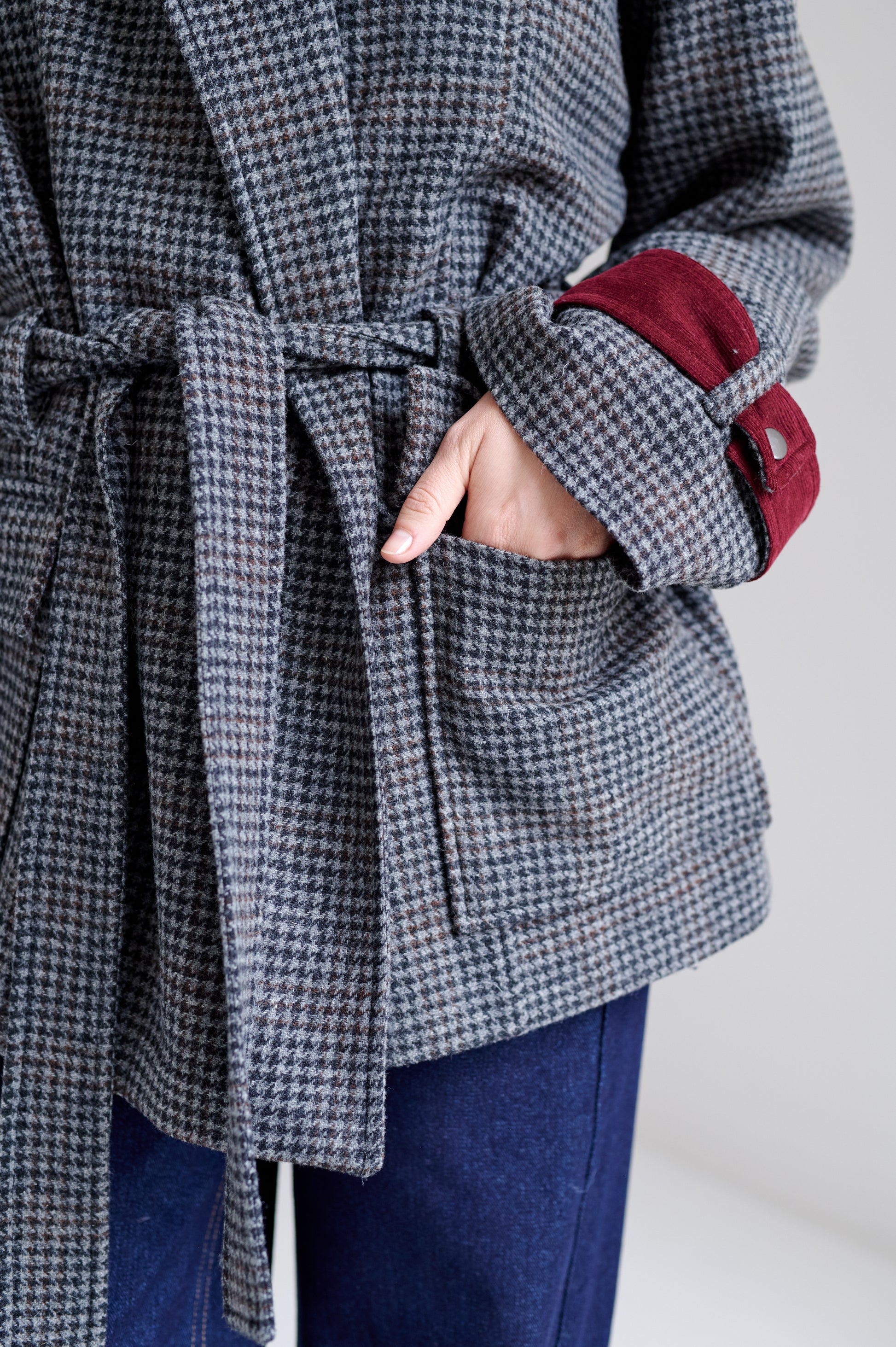 Saco tipo abrigo con cinturón. Detalle de puños y cuello en contraste.