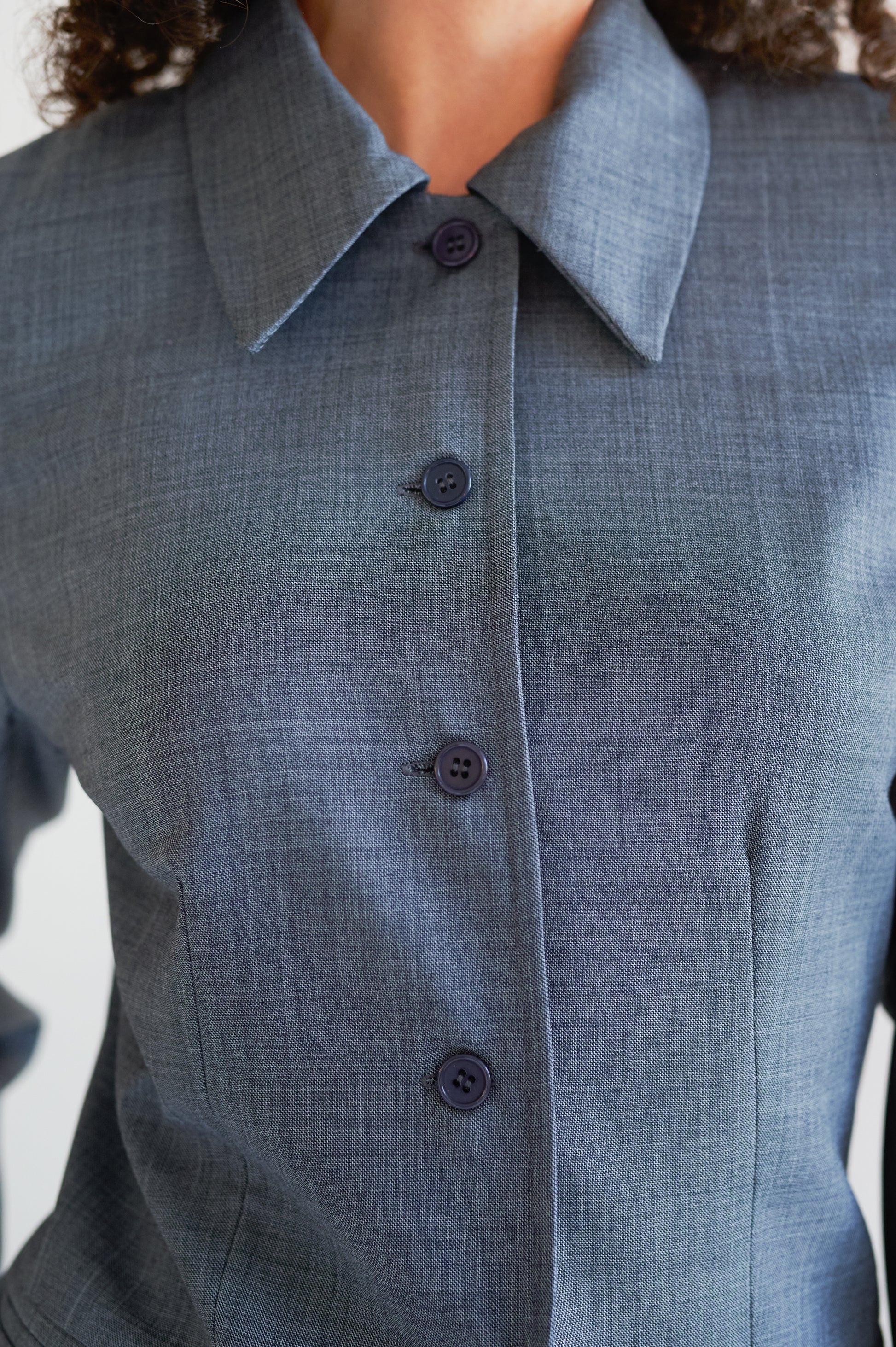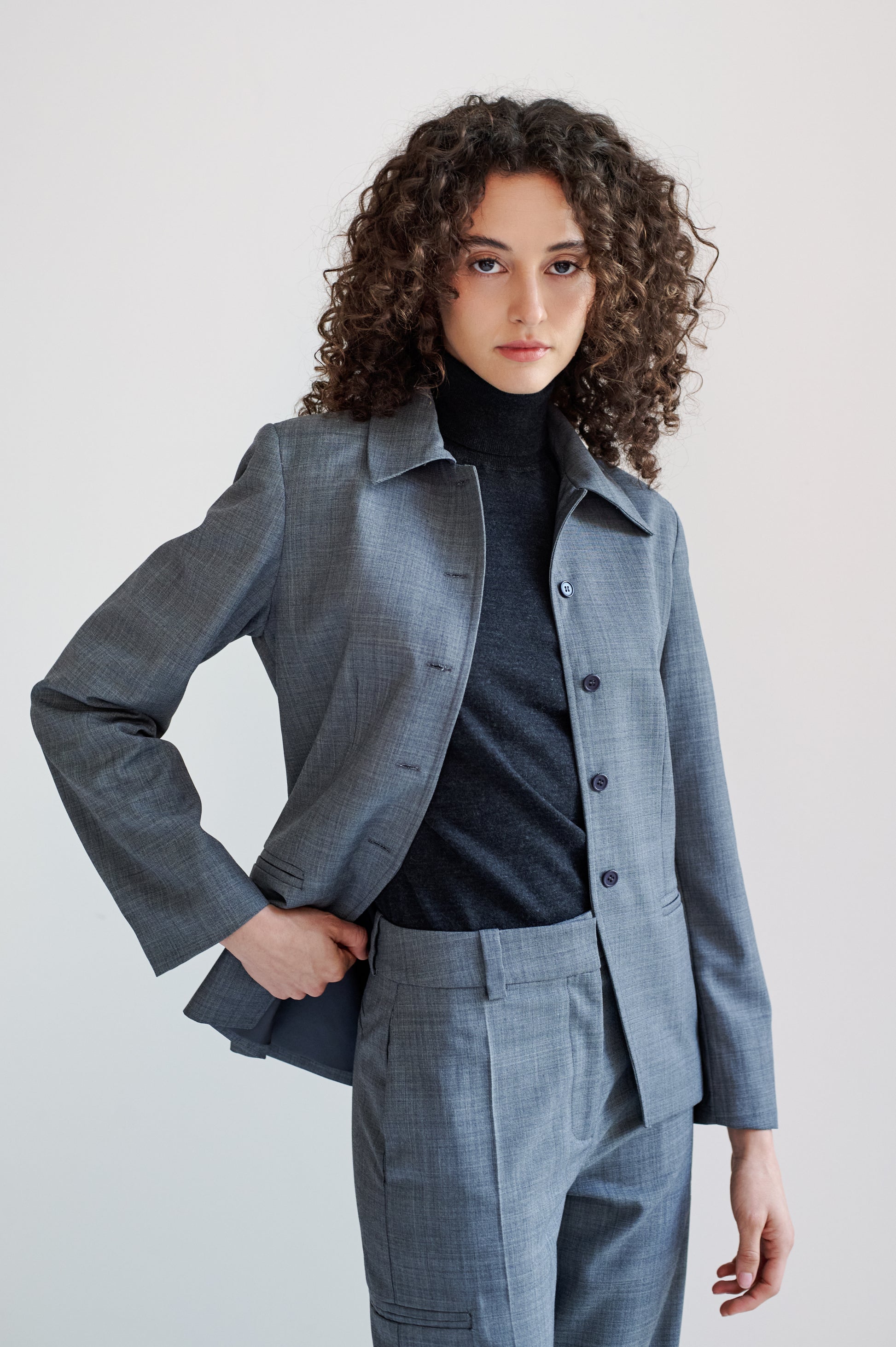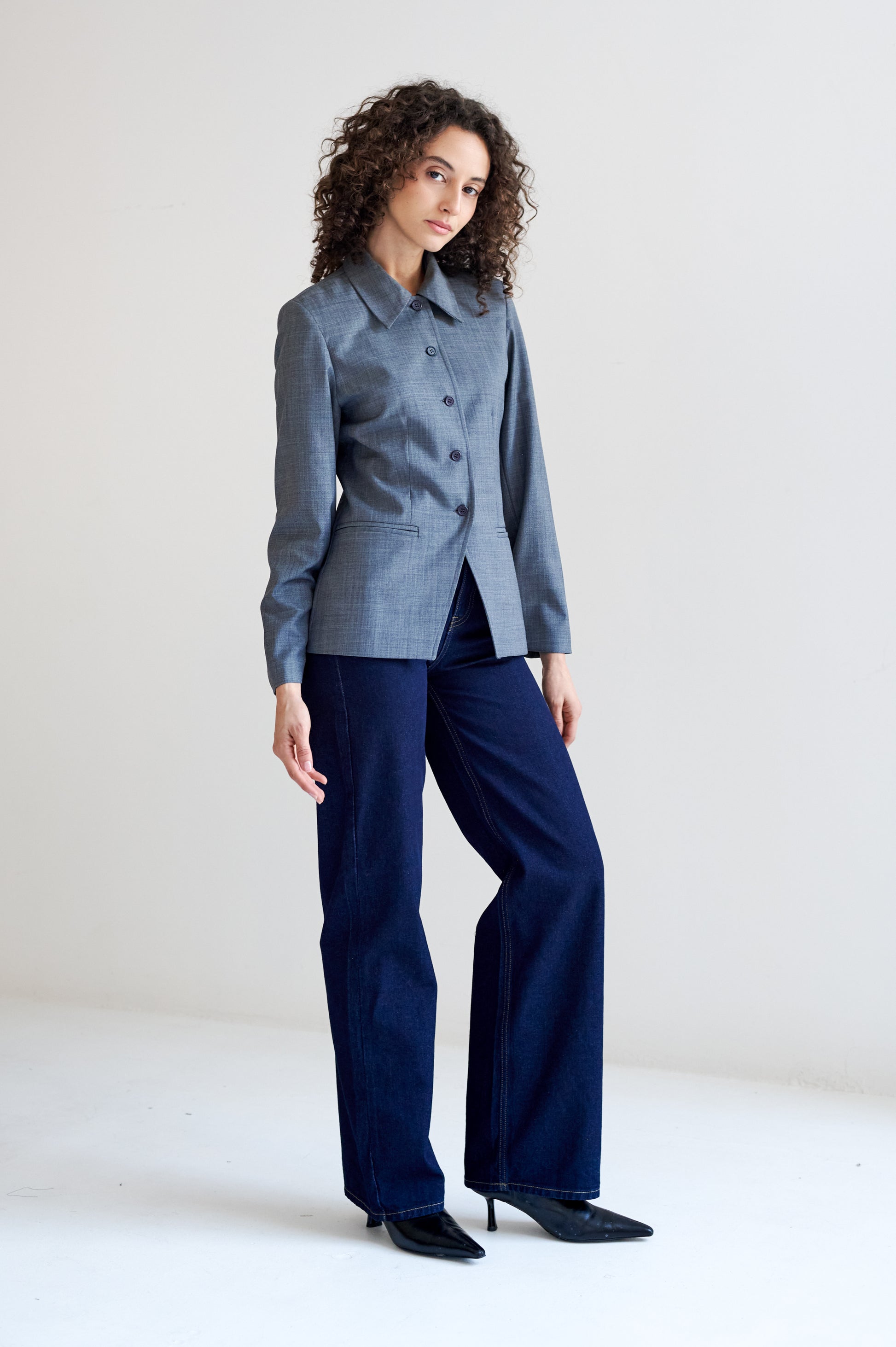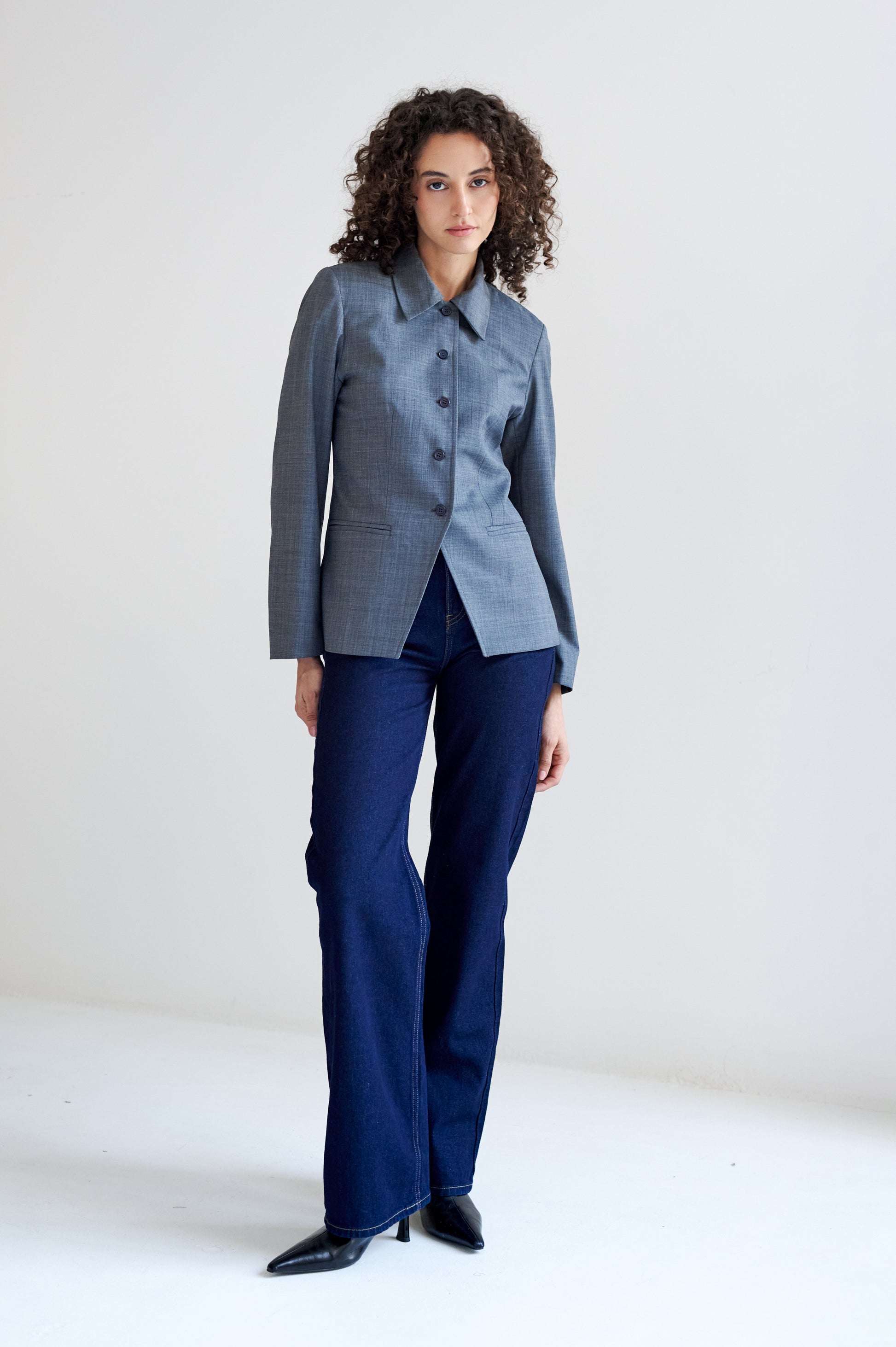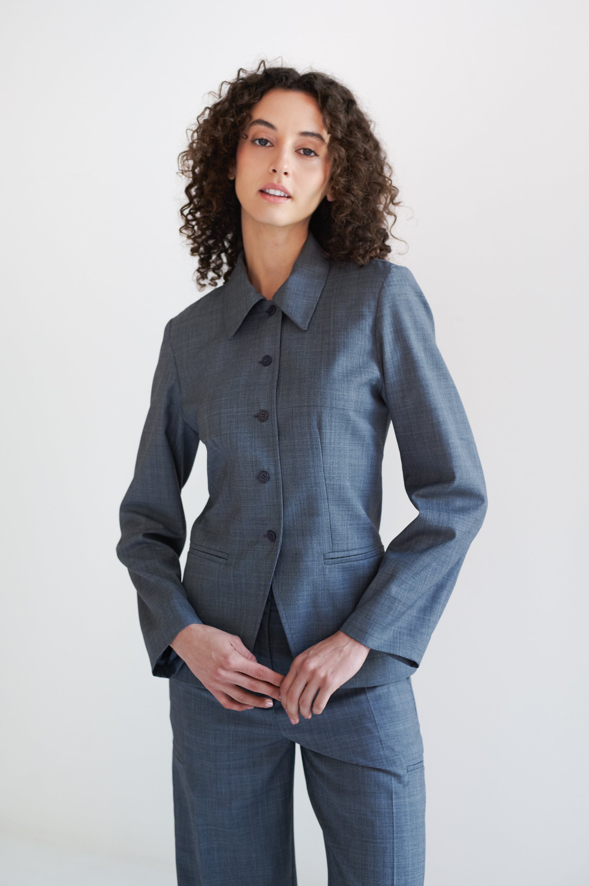 Saco sastrero ligeramente acinturado, confeccionado en tela de acabado jaspeado. Diseño con cuello clásico, botones frontales al tono y bolsillos de vivo. Su fit define suavemente la cintura sin ser ajustado.