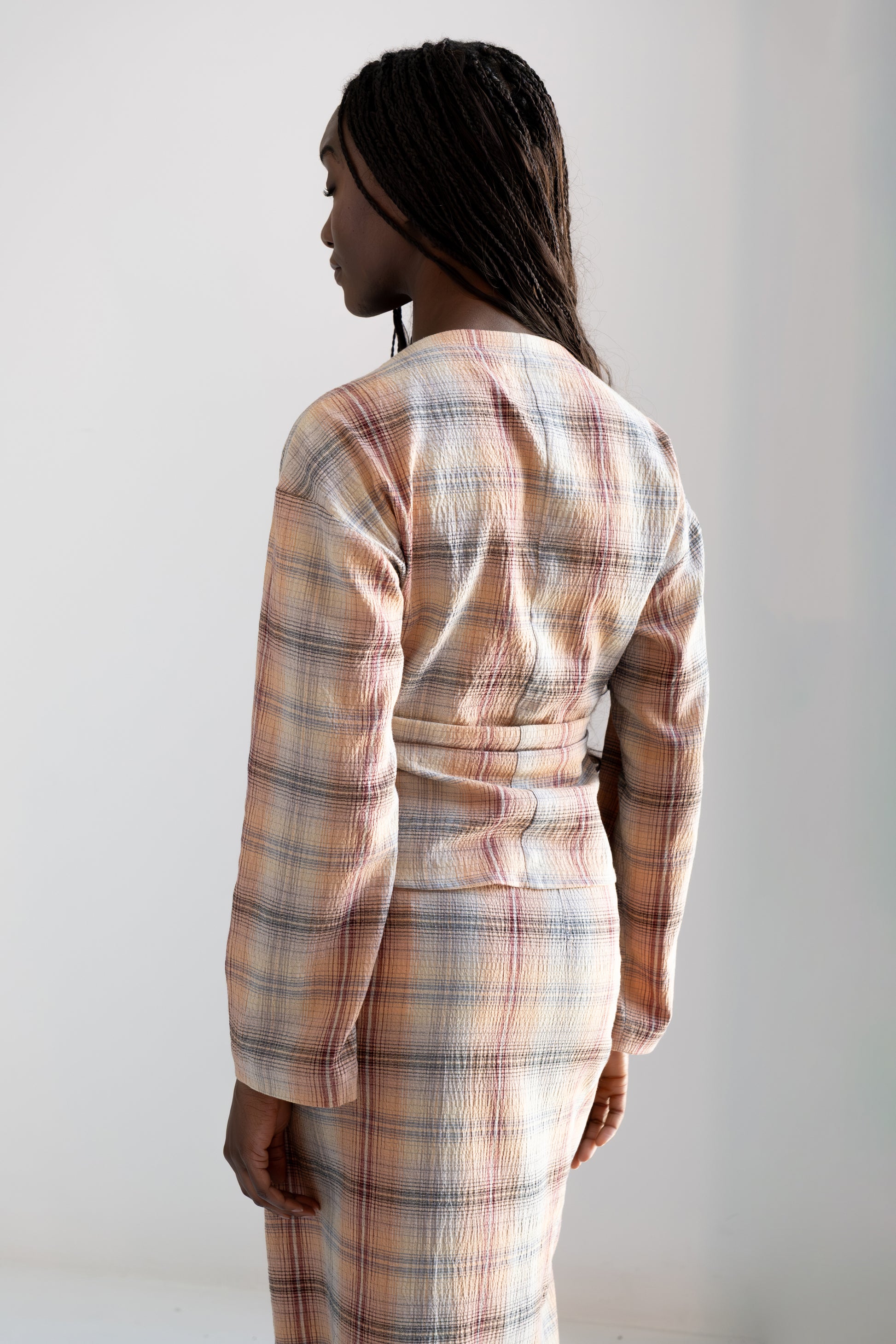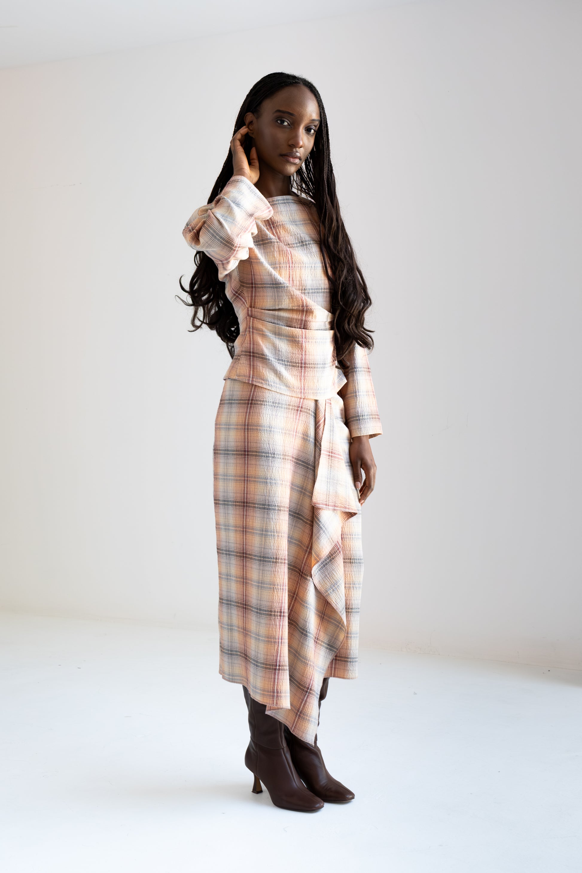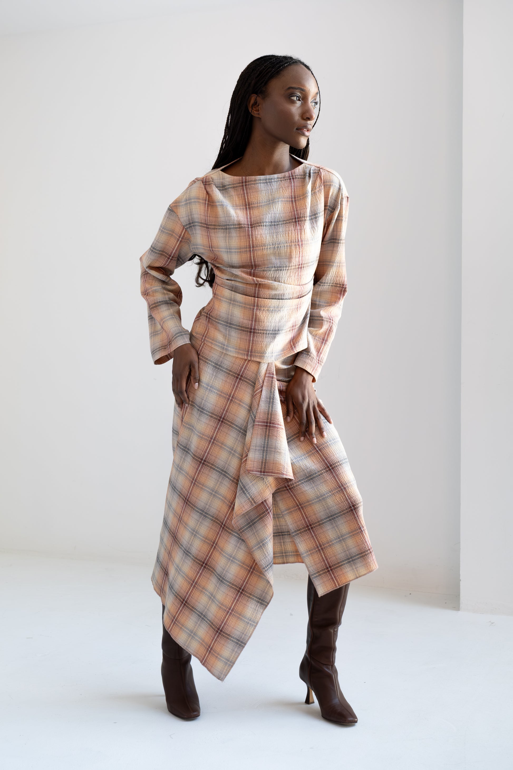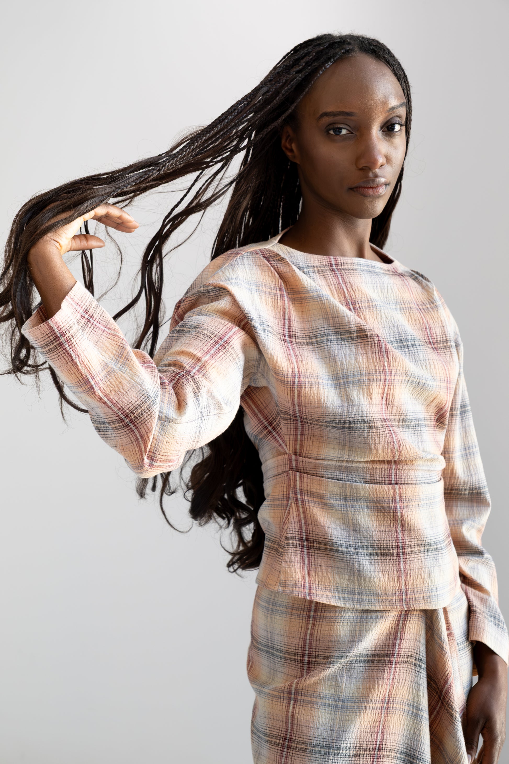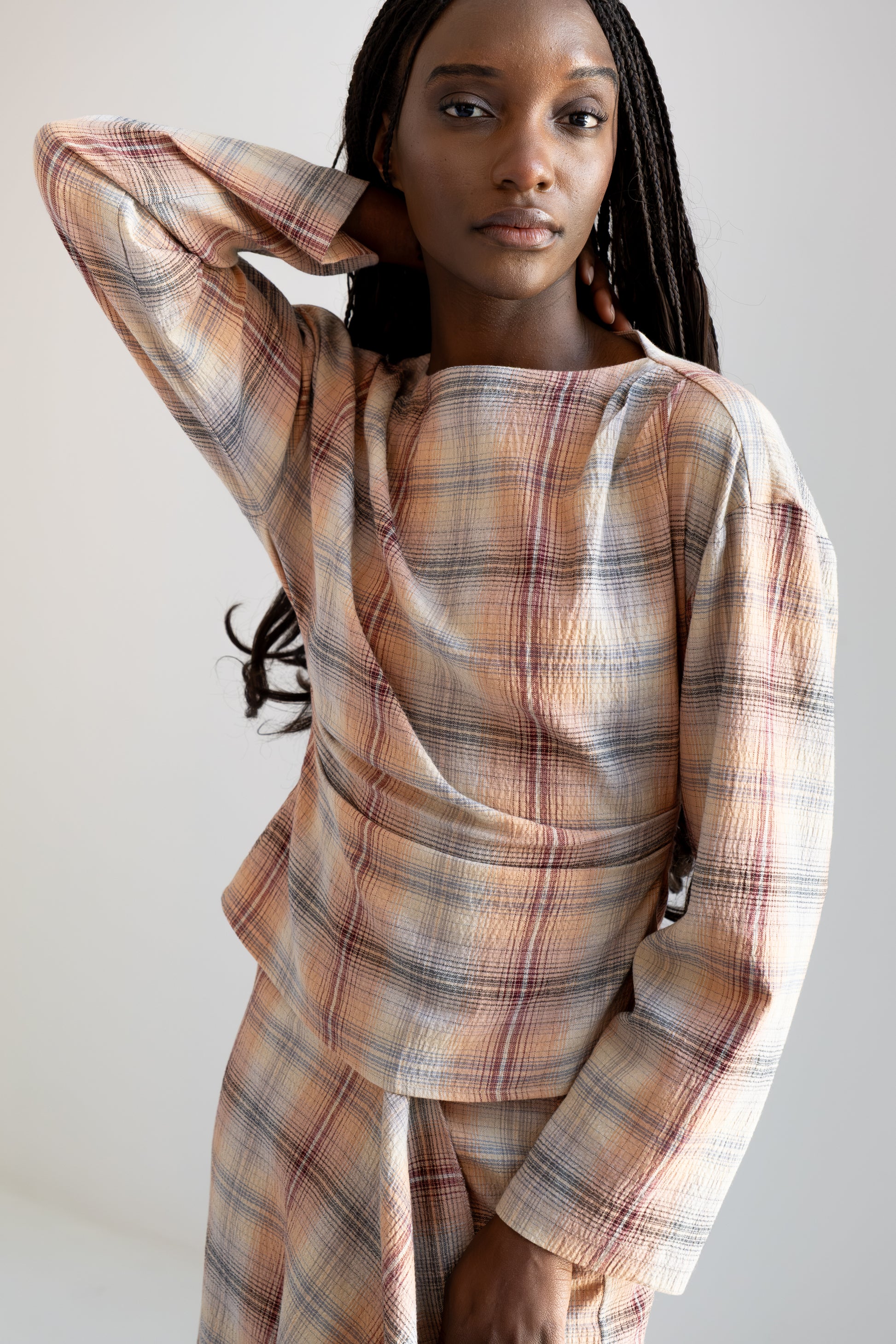 Top oversize de manga larga con drapeado suave y cuello barco. Ajustado en la cintura para acentuar la silueta.
