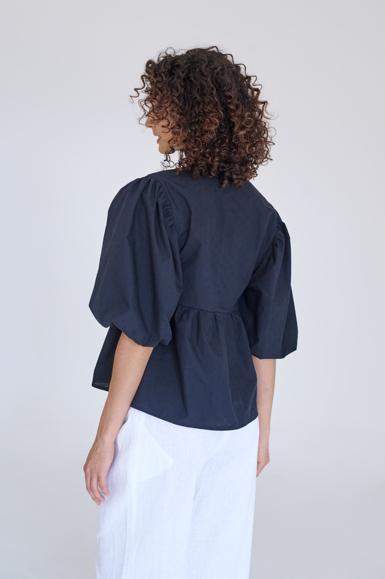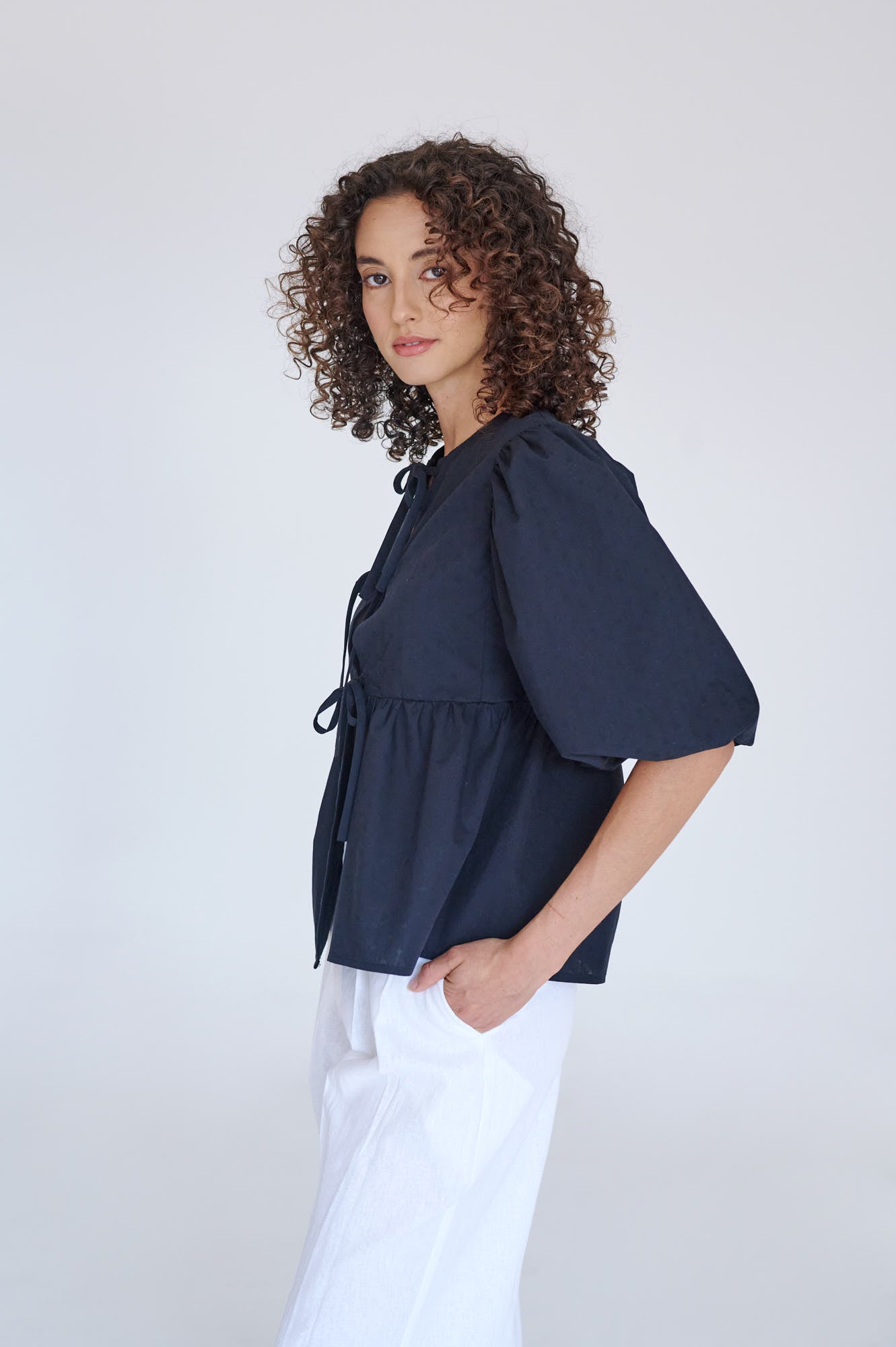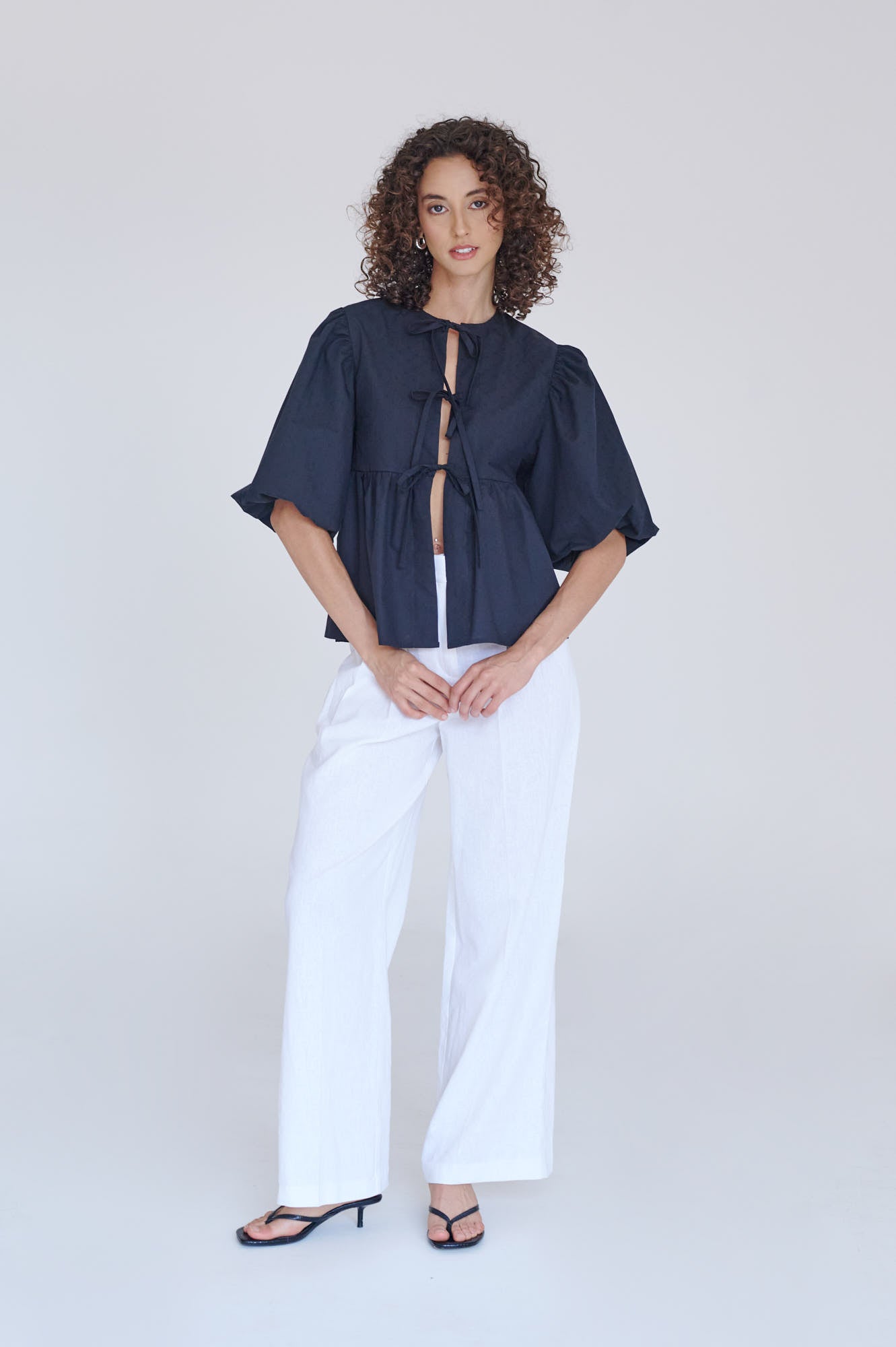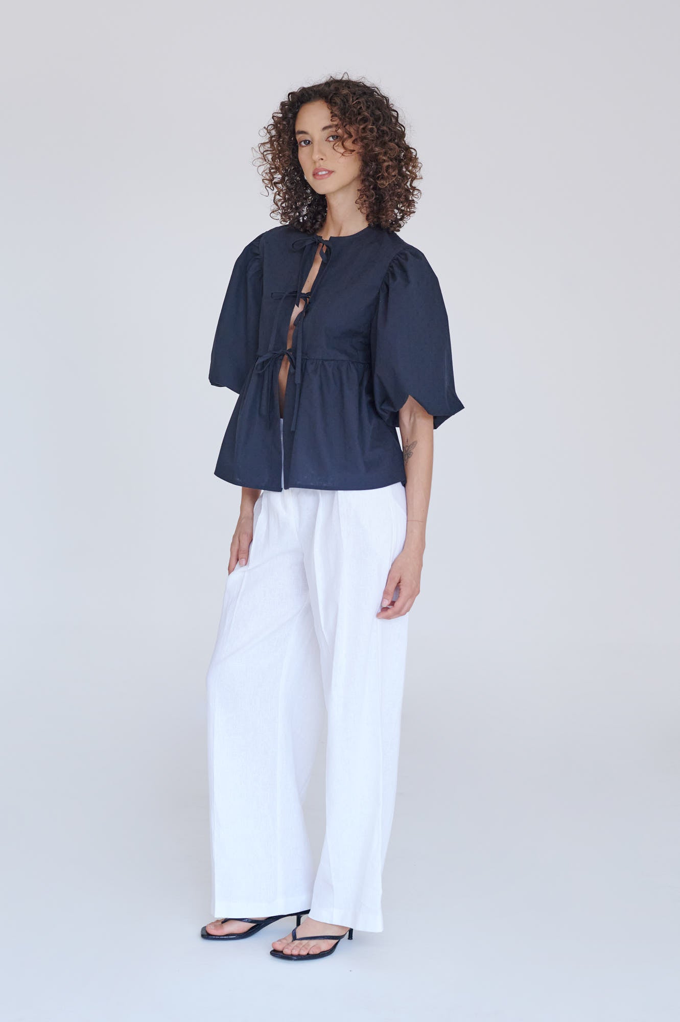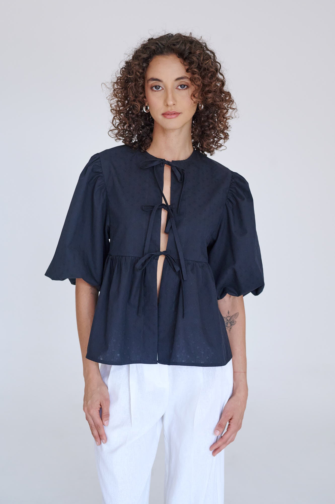 Blusa esvoaçante com mangas bufantes e fitas no centro da frente.
