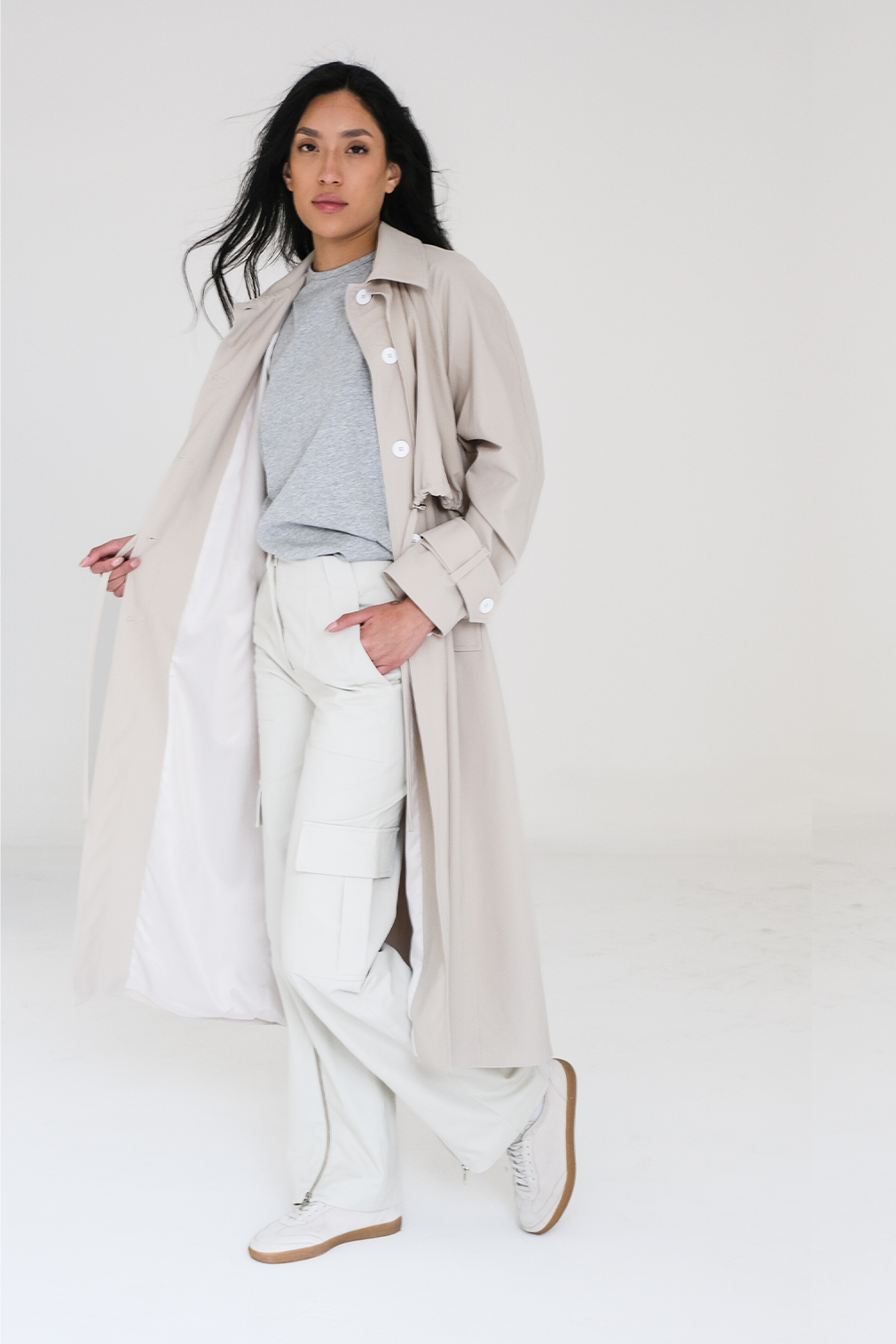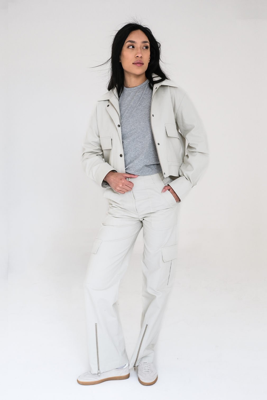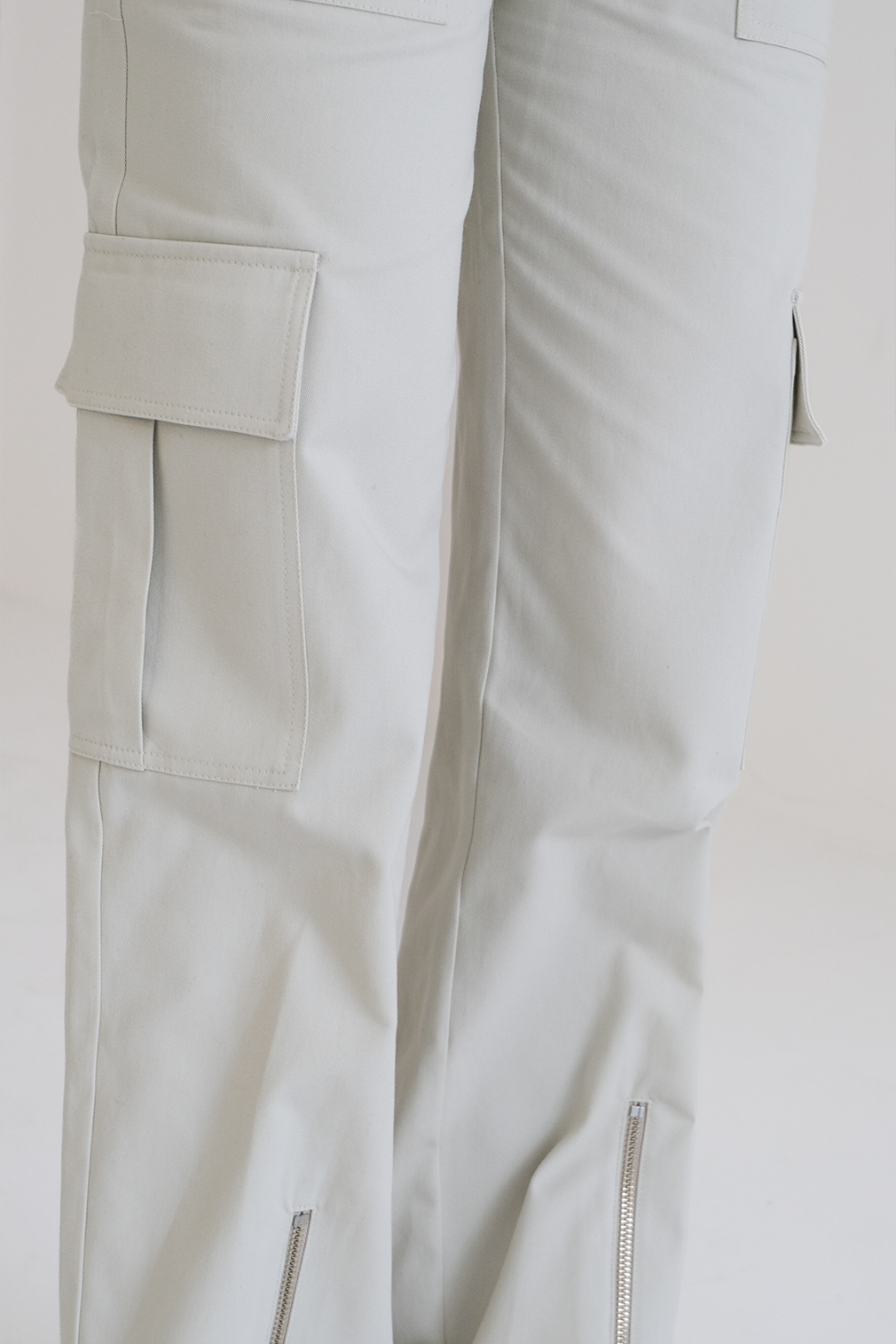 Calças retas com fechos e reguladores no tornozelo.
