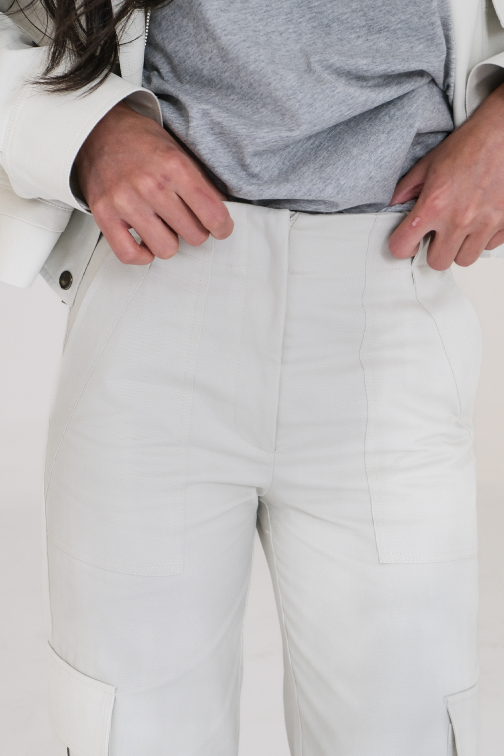 Calças retas com fecho central frontal e bolsos aplicados.