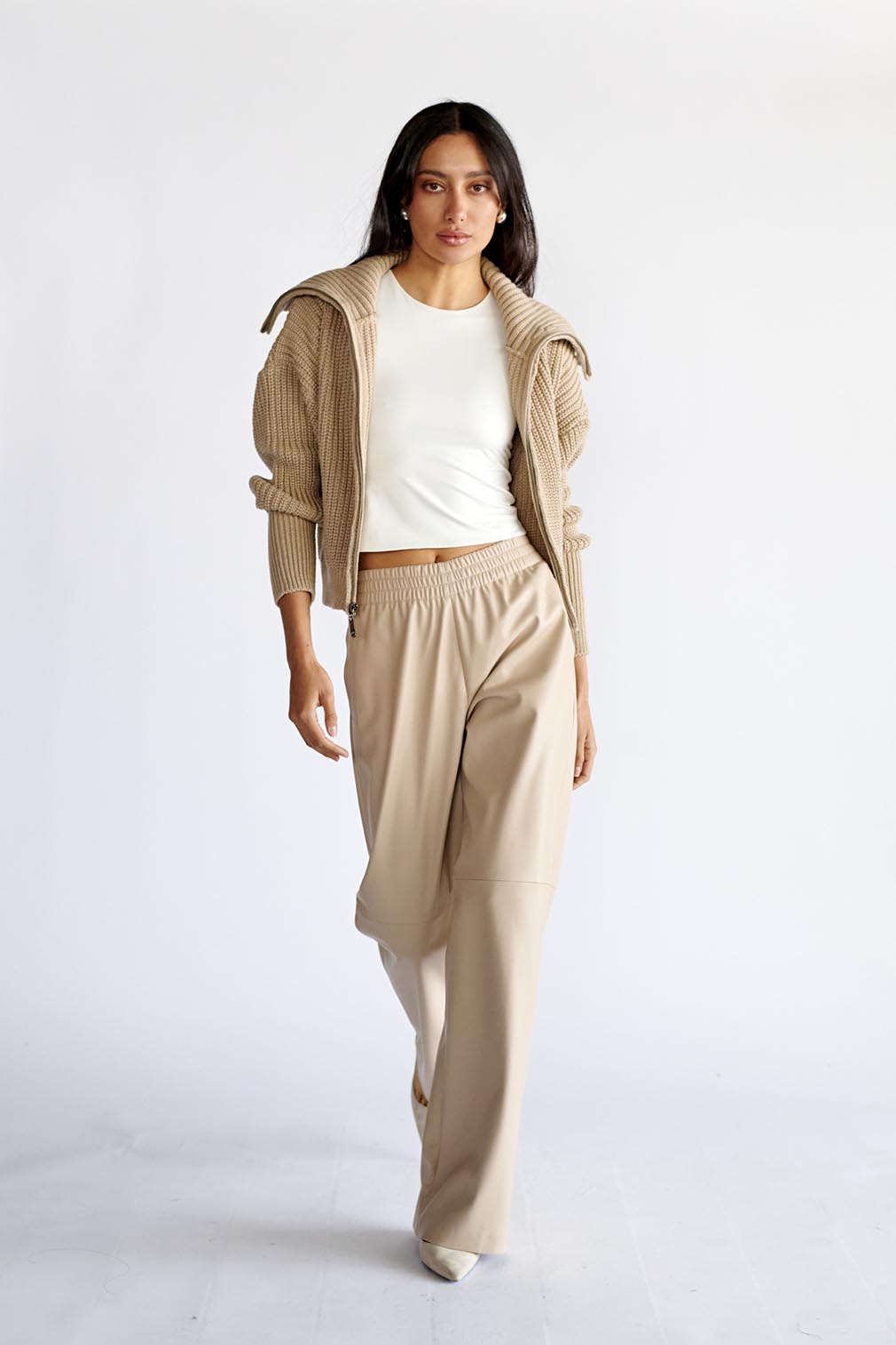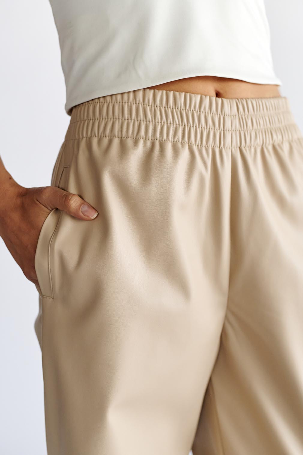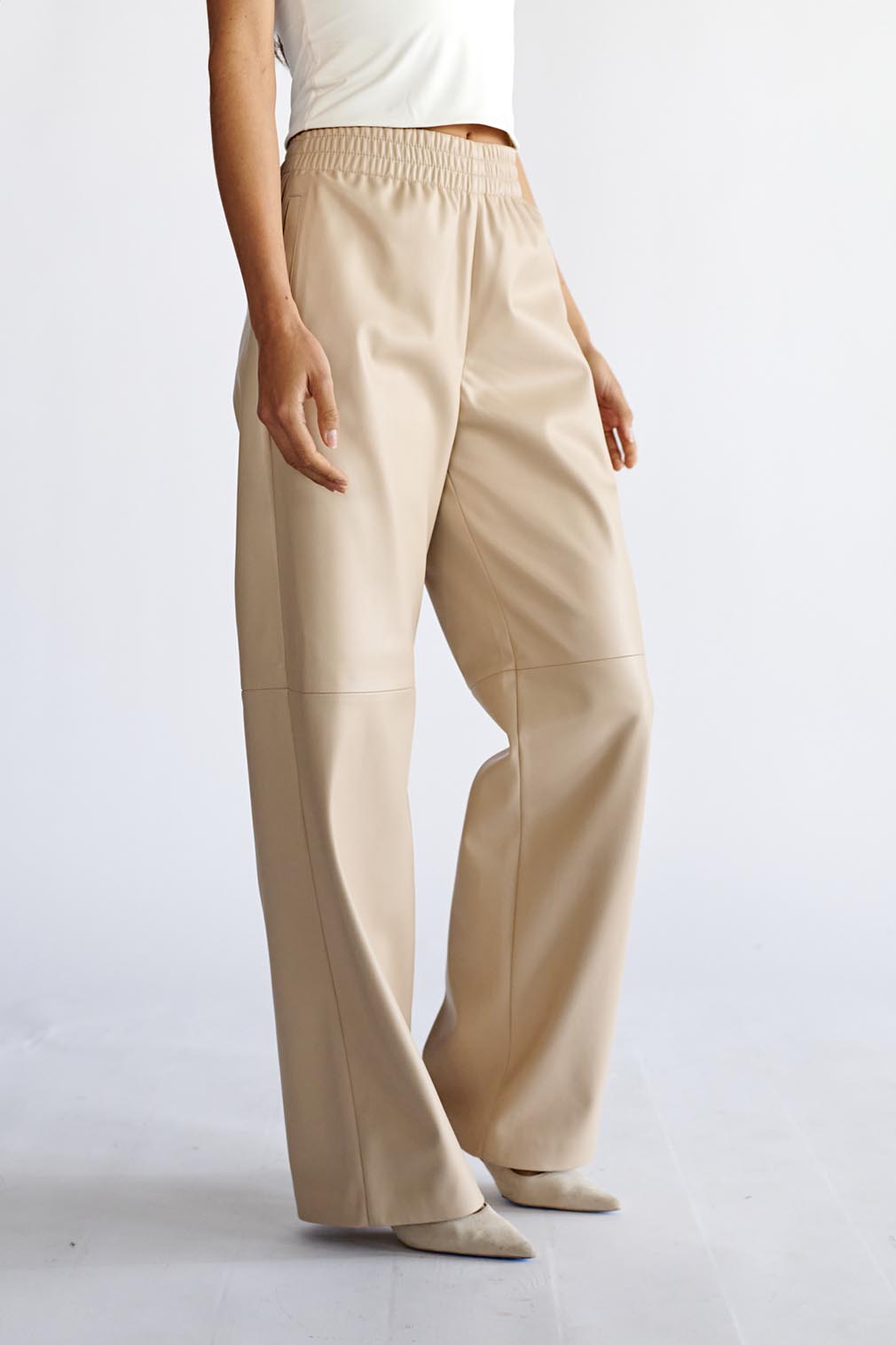 Calça fluida de pelúcia com cós elástico e cordão. Bolsos frontais.