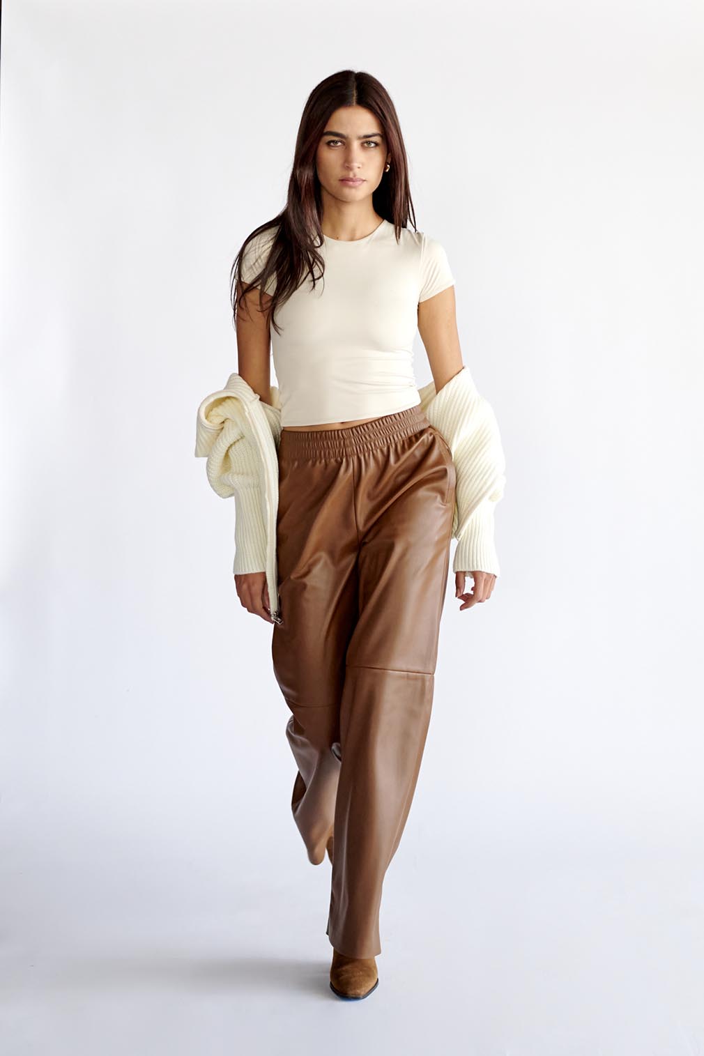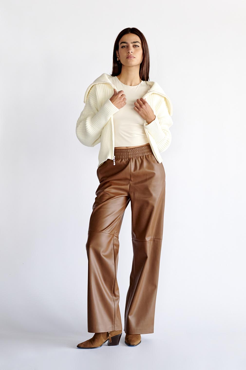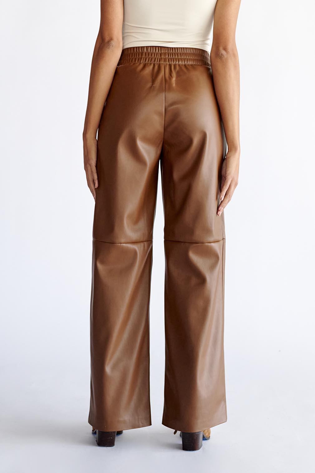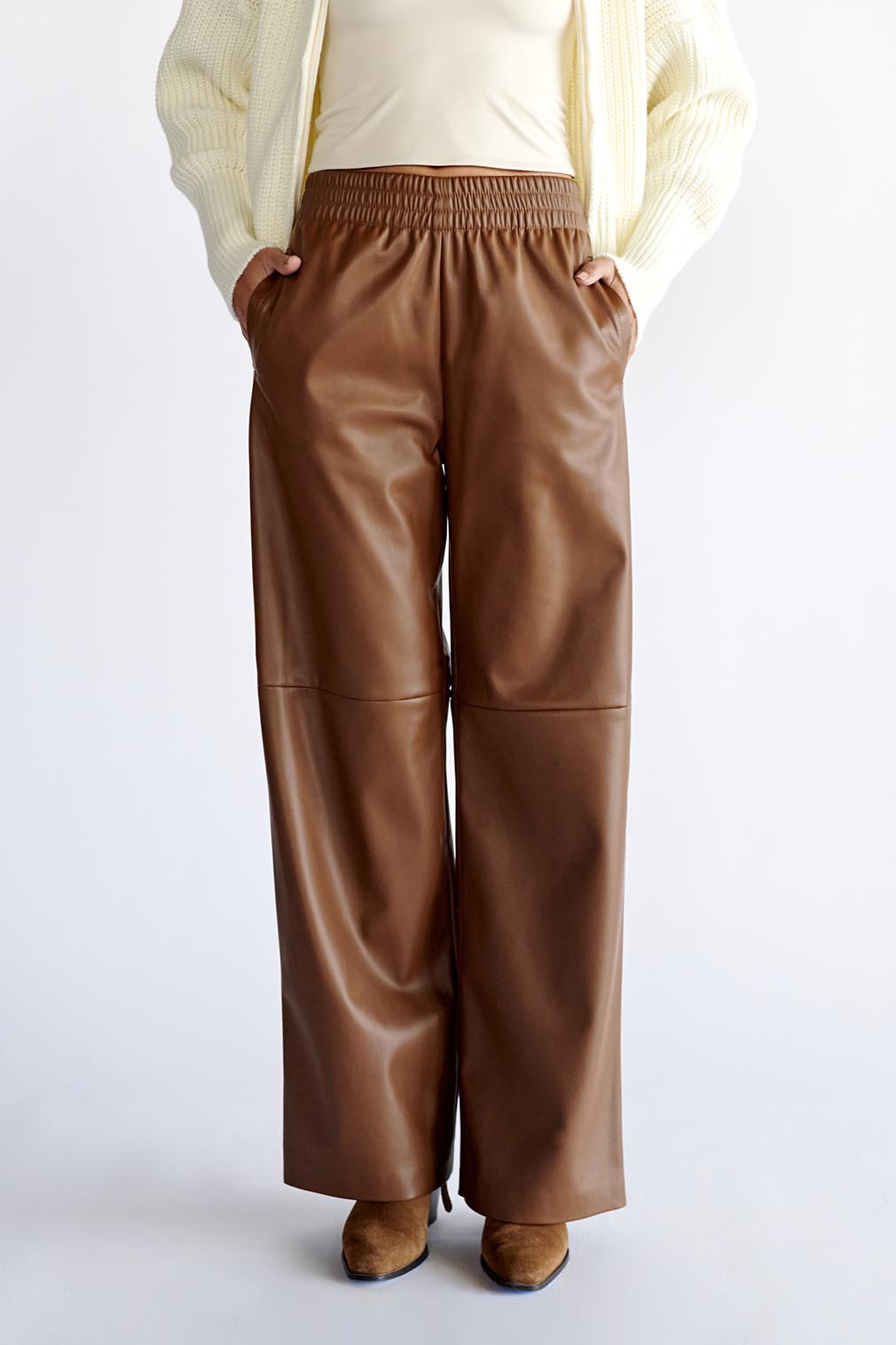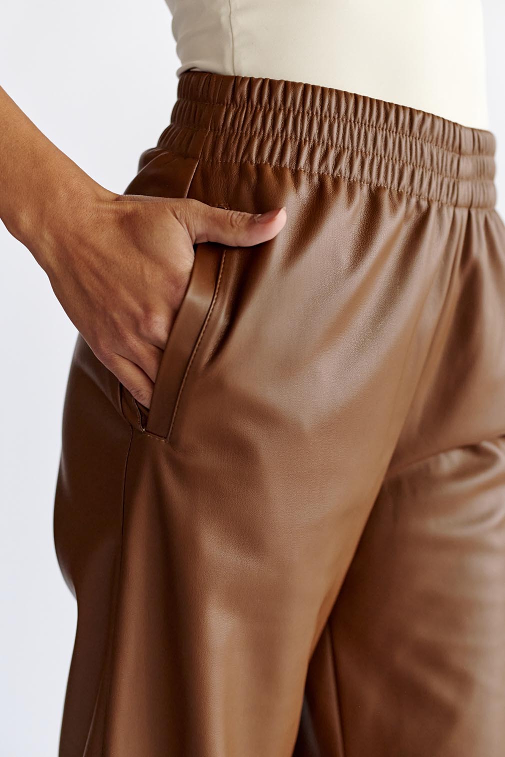 Calça fluida de pelúcia com cós elástico e cordão. Bolsos frontais.