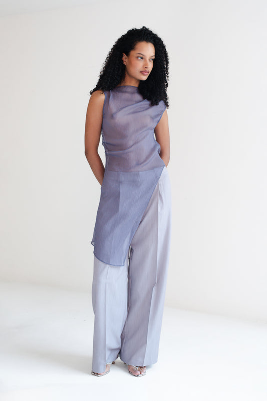Top transparente con diseño asimétrico, cuello alto y silueta sin mangas.