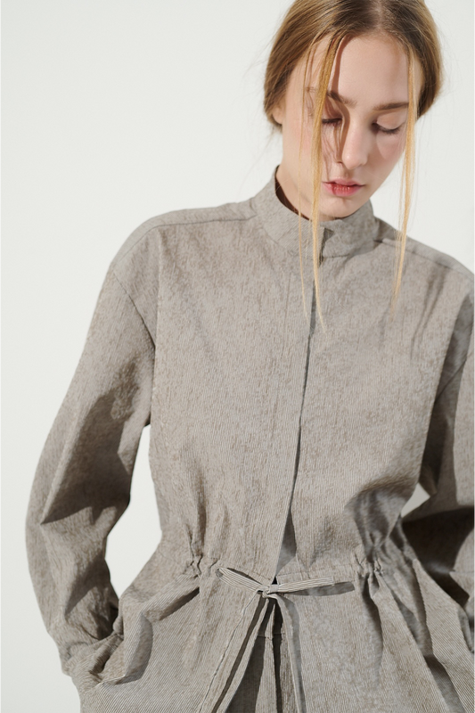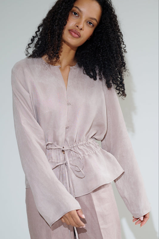 100% LINO Blusa con cuello mao, botones frontales y detalle de frunce en el pecho....