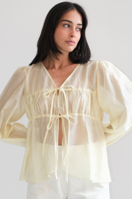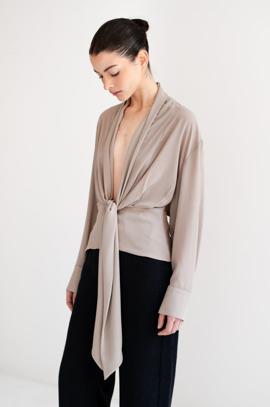 100% POLIESTER Blusa levemente transparente con escote profundo y drapeado frontal. Detalle de lazo en...