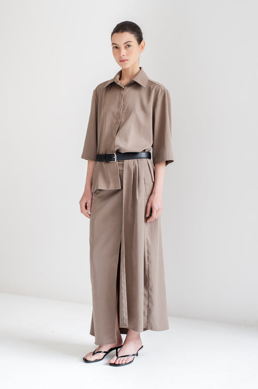 100% TENCEL alda midi con drapeado en cadera y tablas laterales en la apertura. Silueta...