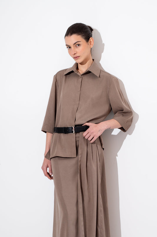 100% TENCEL Blusa con escote en V y mangas largas amplias. Diseño de corte recto...