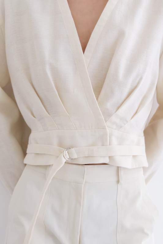100% ALGODÓN Top cruzado con escote en V y mangas largas. Diseño entallado con pretina...