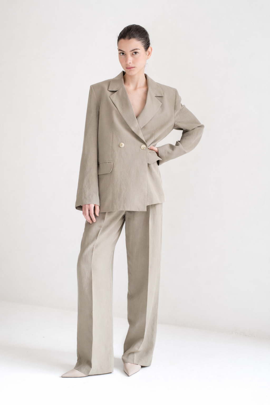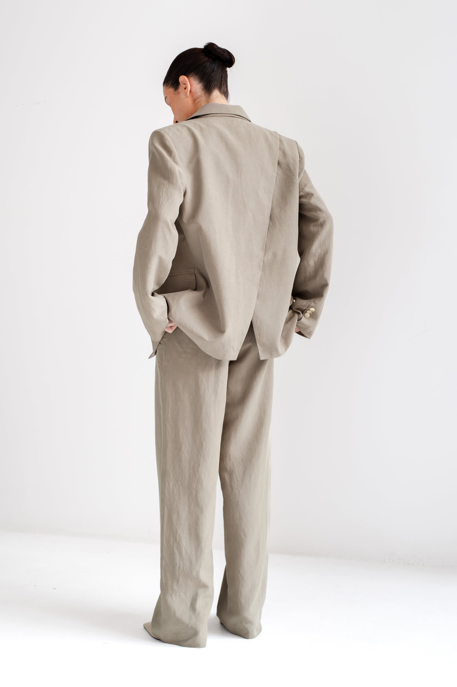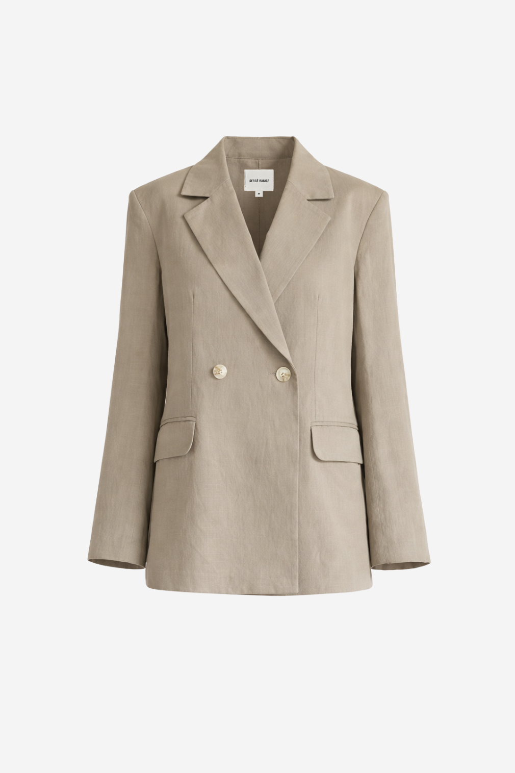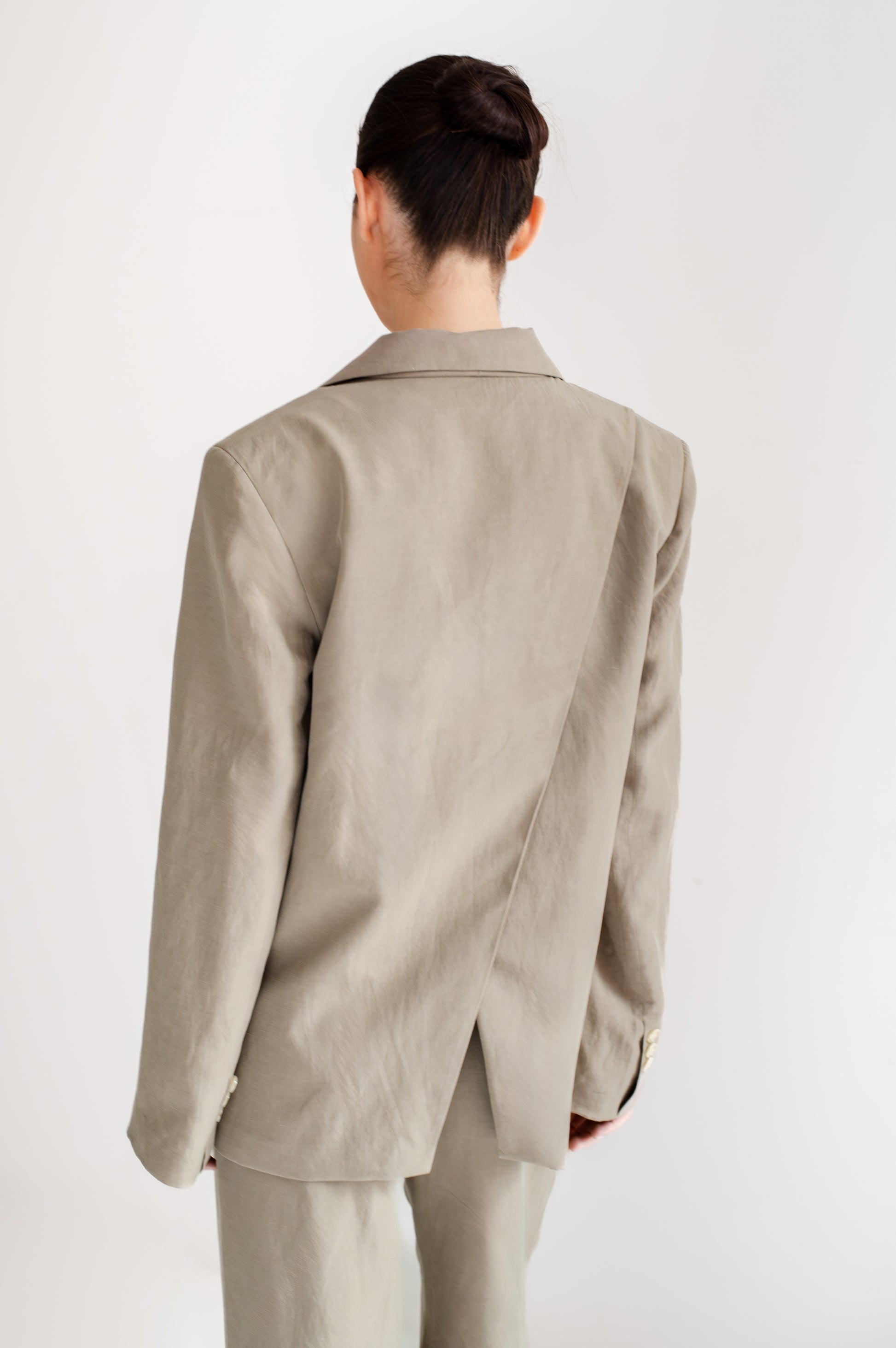 Saco sastre de corte recto con solapa clásica y cierre frontal cruzado con botones. Bolsillos con tapa al frente y detalle de panel cruzado en la parte posterior.