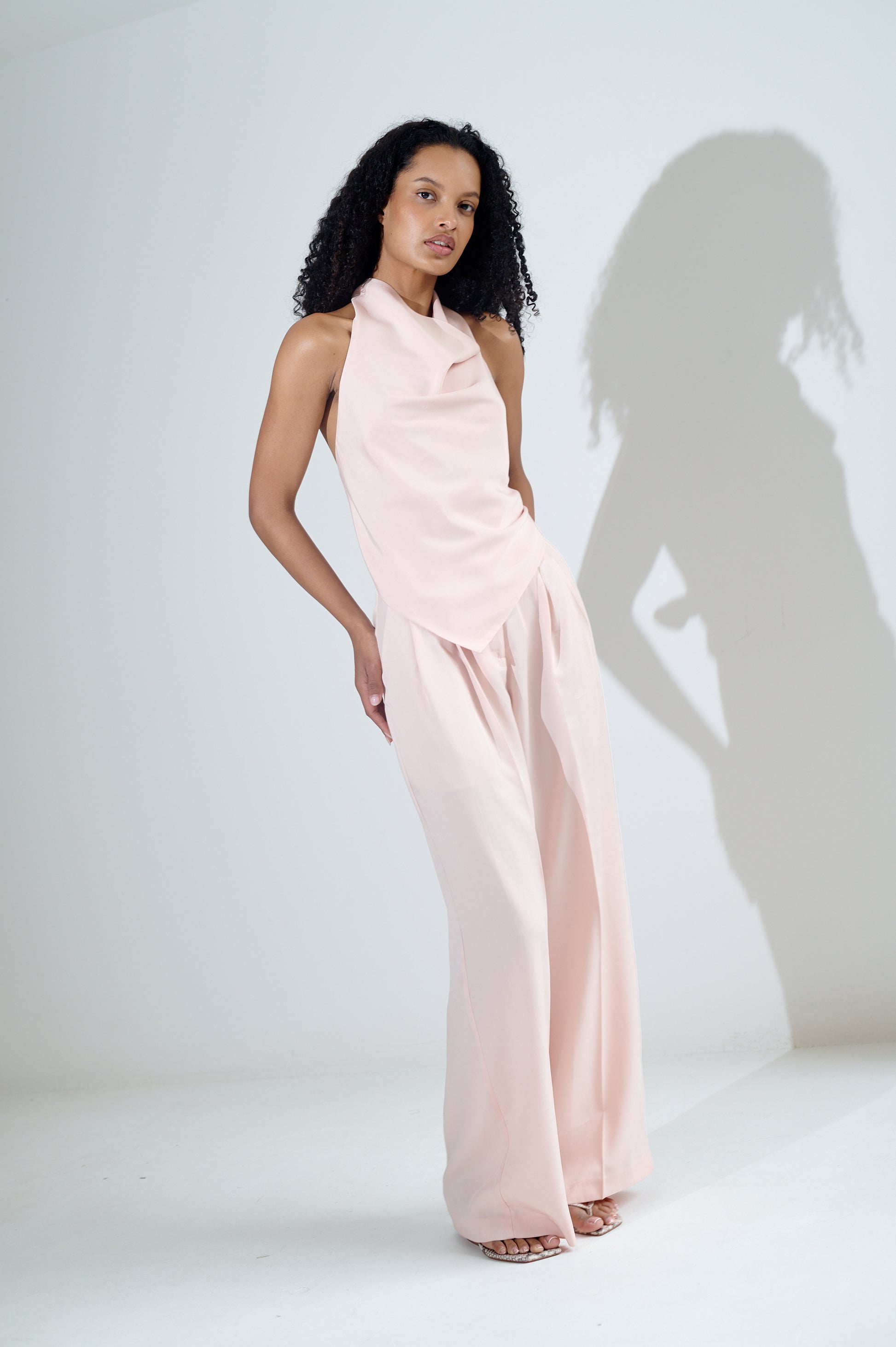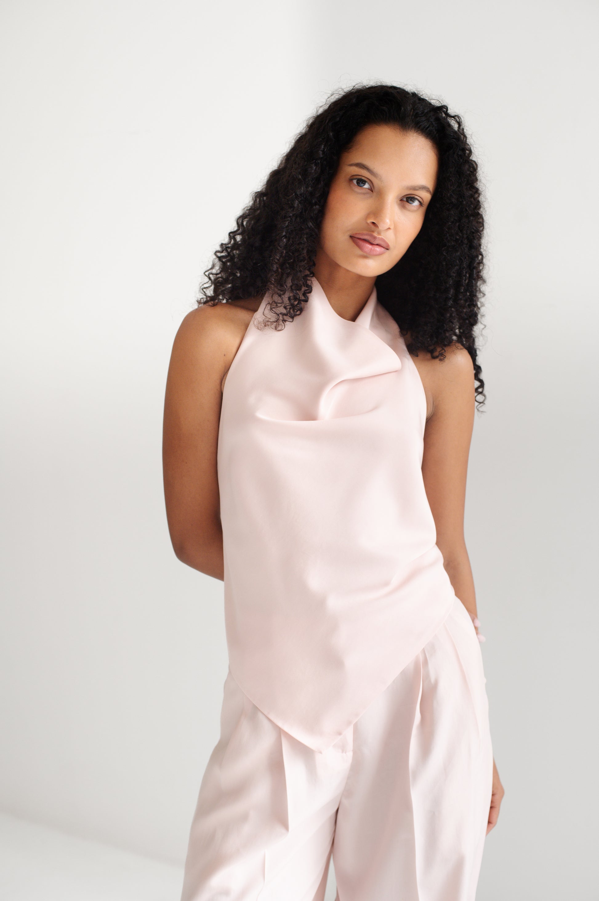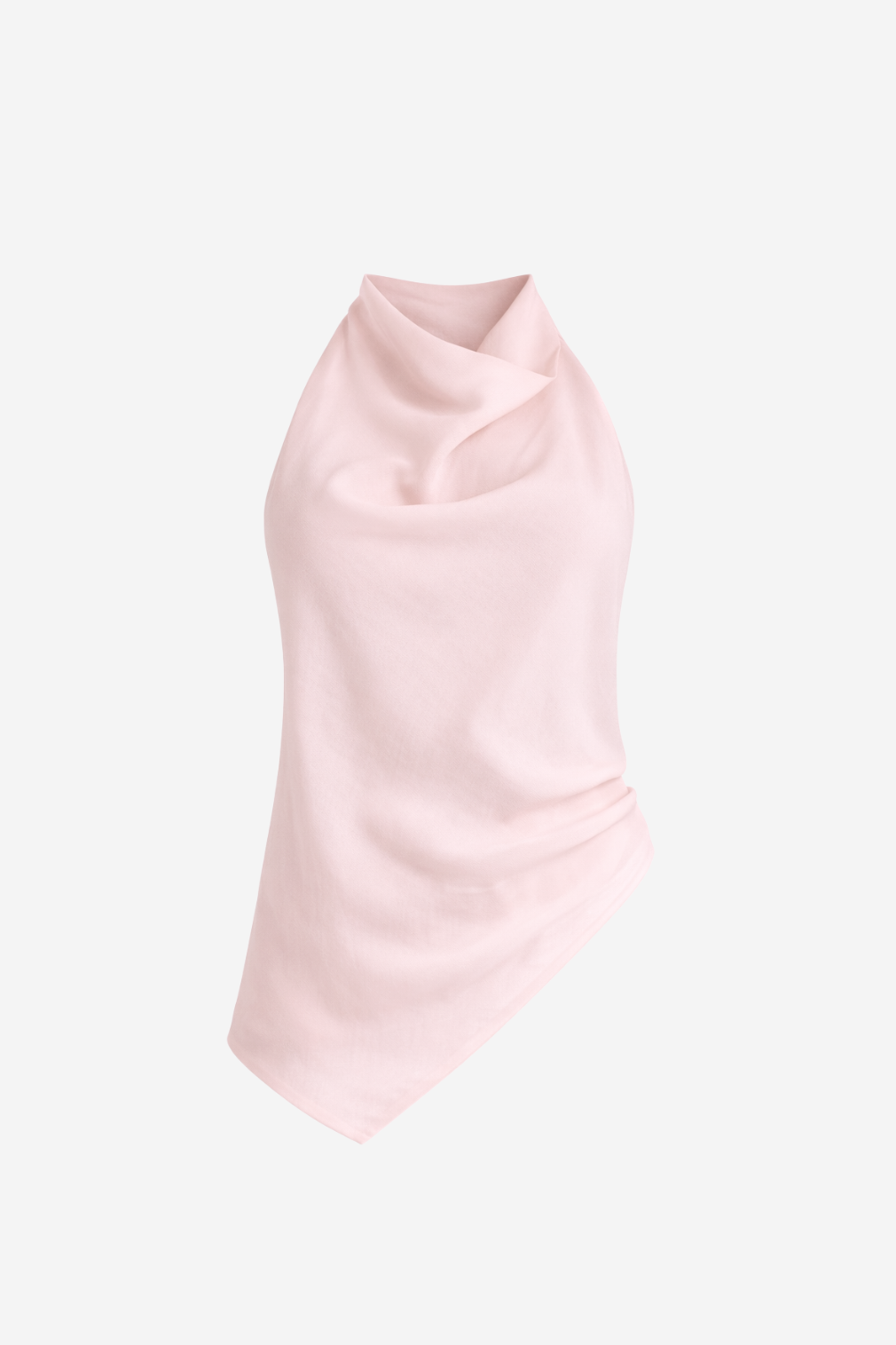 Top halter con escote drapeado y espalda descubierta. Ajuste posterior con lazo.