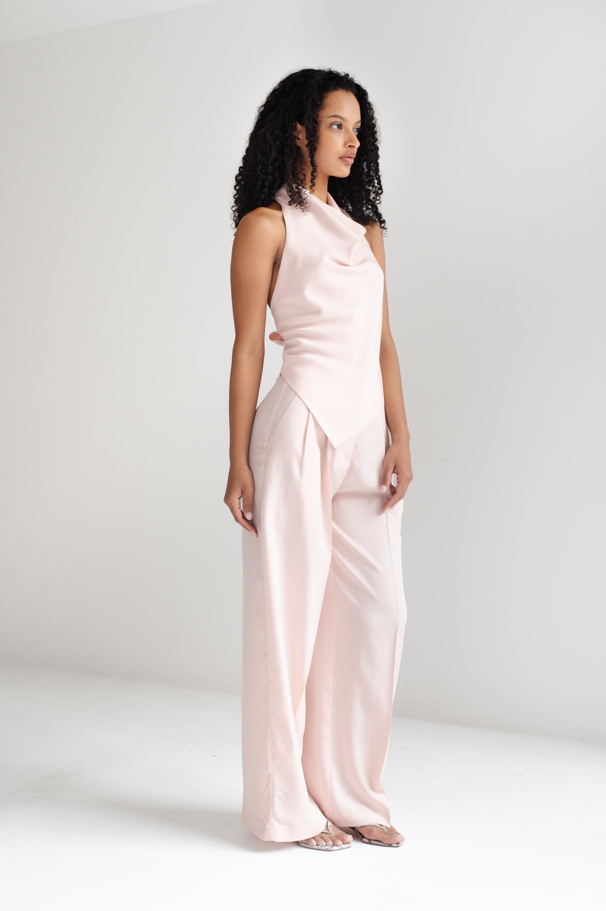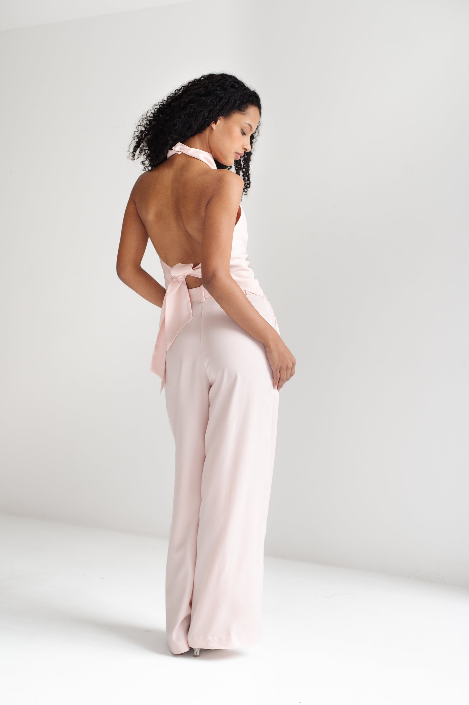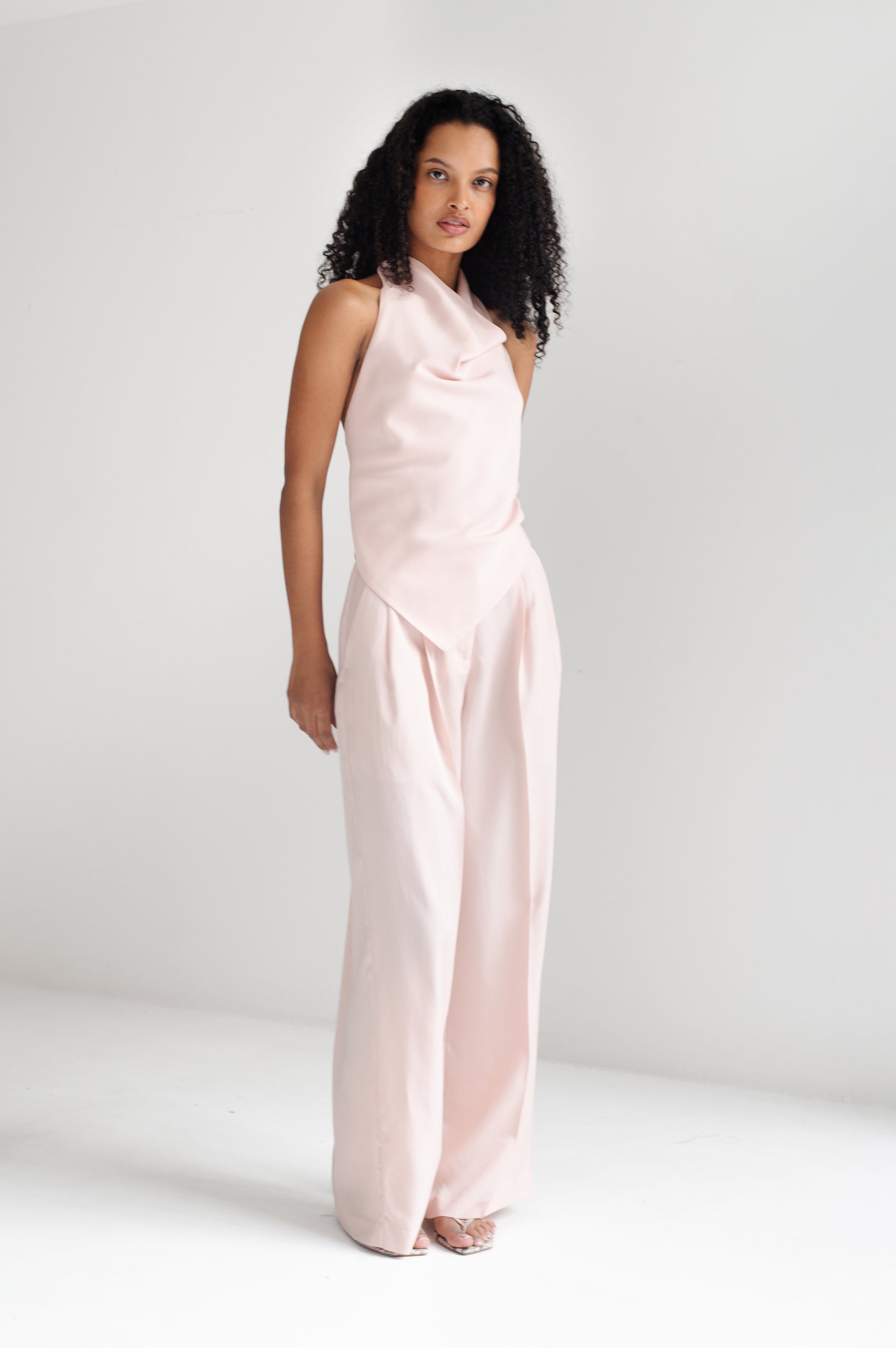 Top halter con escote drapeado y espalda descubierta. Ajuste posterior con lazo.